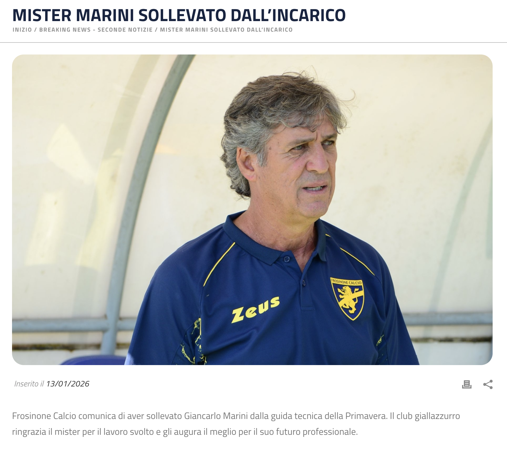Con una nota diffusa nella mattinata di martedì, il Frosinone ha comunicato l’esonero di Giancarlo Marini dalla guida della formazione Primavera. Nel comunicato, il club ha espresso il proprio ringraziamento al tecnico per il lavoro svolto e la professionalità dimostrata. La decisione arriva a poche ore dal pareggio interno contro l’Hellas Verona e si inserisce in una valutazione più ampia sul percorso della squadra.