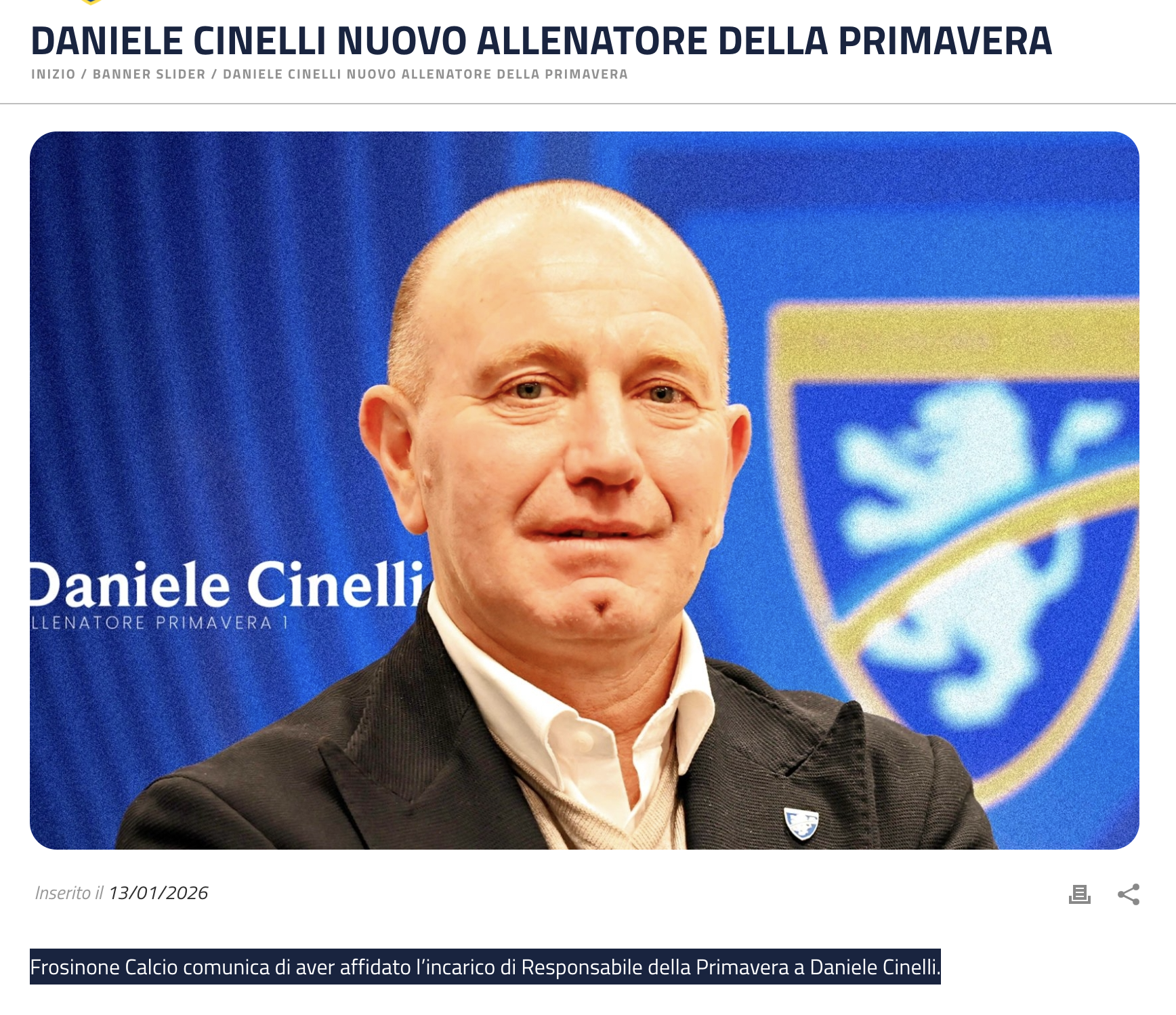 Il successore di Marini è stato annunciato ed è Daniele Cinelli, 50 anni e già tecnico di Pompei e Cavese dopo l'esperienza nei quadri tecnici dell'ACR Messina. Nel suo passato anche diverse un'esperienza nell'Avellino e nel Settore Giovanile del Benevento. Ex calciatore (tra le altre ha vestito le maglie di Benevento, Pescara, Avellino, L'Aquila e Fano), è stato annunciato dal club già nella serata di martedì: «Frosinone Calcio comunica di aver affidato l’incarico di Responsabile della Primavera a Daniele Cinelli».