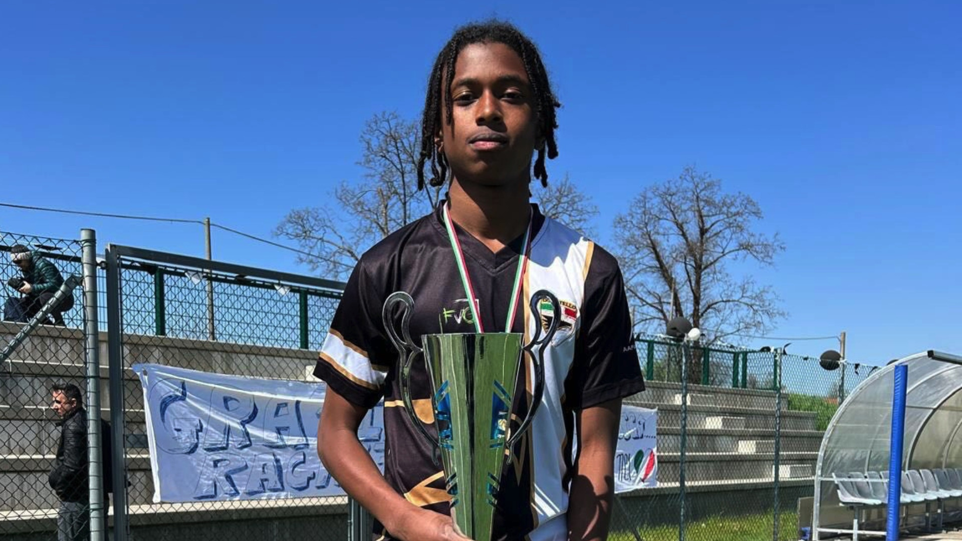 Jaden Xavier Mina Landazuri che solleva la coppa dopo aver vinto da protagonista il campionato con la Donatello Under 15 nella stagione 2024-25