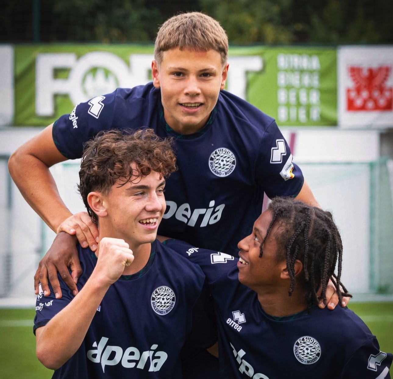 Pohl, Eschgfeller e Mina che esultano dopo un gol con il Sudtirol U16