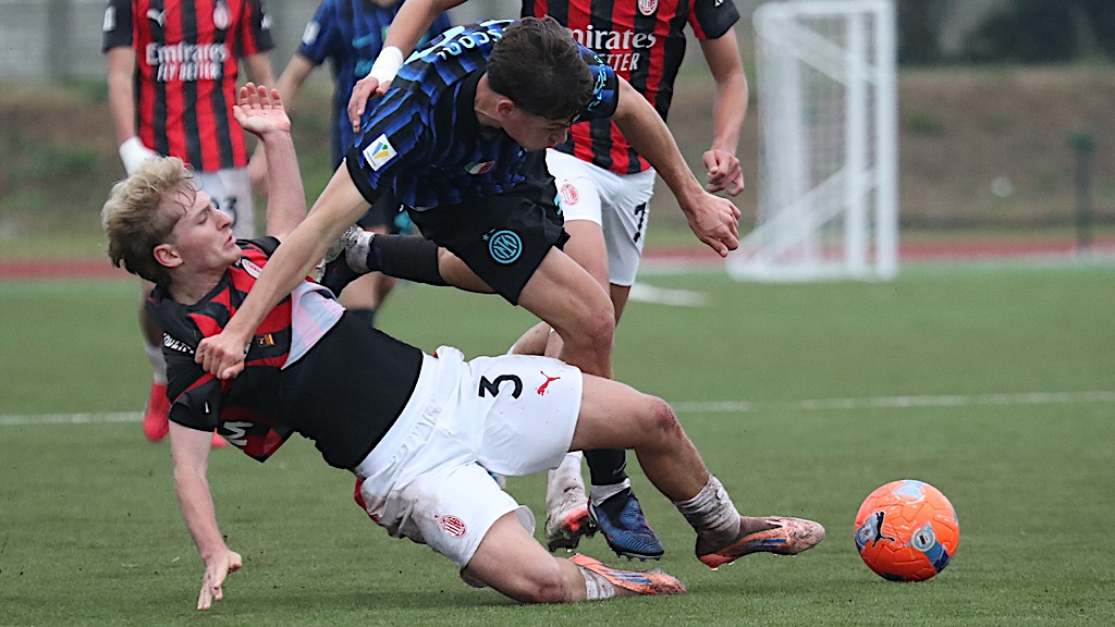 Prima tra i pali della porta del Milan, ma ancora prima di cominciare la partita. Longoni, acciaccato, non supera l'ultimo test per poter giocare, Bianchi - il suo sostituto - si fa male nel riscaldamento e quindi in porta ci va il classe 2009 Faccioli, all'esordio assoluto in campionato. Poi nell'area di rigore dell'Inter, presa d'assalto da una manovra rossonera fin da subito feroce e capace di pungere non appena le maglie avversarie si allargano. I ragazzi di Benny Carbone - che, senza un monumento con Iddrissou in attacco schiera Kukulis confermando Zouin e completando il reparto con Mosconi - provano infatti a prendere campo lavorando soprattutto sugli esterni (Della Mora a destra e Ballo adattato a sinistra), ma sono quelli di Giovanni Renna a farsi preferire. E così il primo doppio squillo del match - punizione di Lontani che Taho respinge, sulla ribattuta c’è Mancioppi che va al tiro ma Taho si supera e mette in calcio d’angolo (11') - è solamente un avvertimento rispetto a quello che succederà più tardi: pennellata di Pandolfi dalla trequarti, Lontani spizza di testa anticipando Peletti e Ballo e infila l’1-0 nell’angolino alla sinistra di Taho (27'); punizione da sinistra di Lontani, sul secondo palo Perera colpisce di testa vincendo il duello fisico con Nenna e insaccando in rete il 2-0 (35'). Al Milan sembra un sogno, all'Inter un incubo. Tant'è che all'intervallo il doppio vantaggio è rossonero.