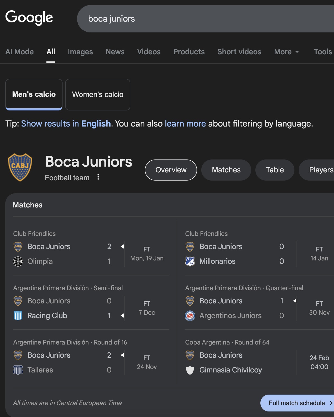 Lo screenshot della ricerca «Boca Juniors» su Google: solo risultati vecchi, la massimo la Copa Argentina, ma niente campionato già iniziato da due giornate