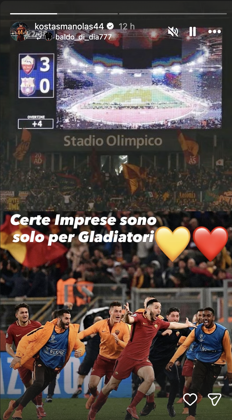 Una foto sgranata che sprigiona rumore anche senza audio: lo Stadio Olimpico in delirio, un’esultanza in corsa, una didascalia secca. Nelle storie di Instagram di Kostas Manolas compare uno scatto-icona e una frase che taglia come una lama: «Certe imprese sono solo per gladiatori». Tempismo chirurgico: il giorno dopo che la Juventus ha sfiorato, in dieci uomini, la rimonta al ritorno contro il Galatasaray, arrendendosi solo ai supplementari. Il calcio vive di simboli e di ferite aperte: e quell’immagine del 10 aprile 2018, quando la Roma spazzò via il Barcellona con un 3-0 da tramandare, è diventata di nuovo un’arma retorica, una cartolina che punge i rivali e rivendica un’appartenenza.