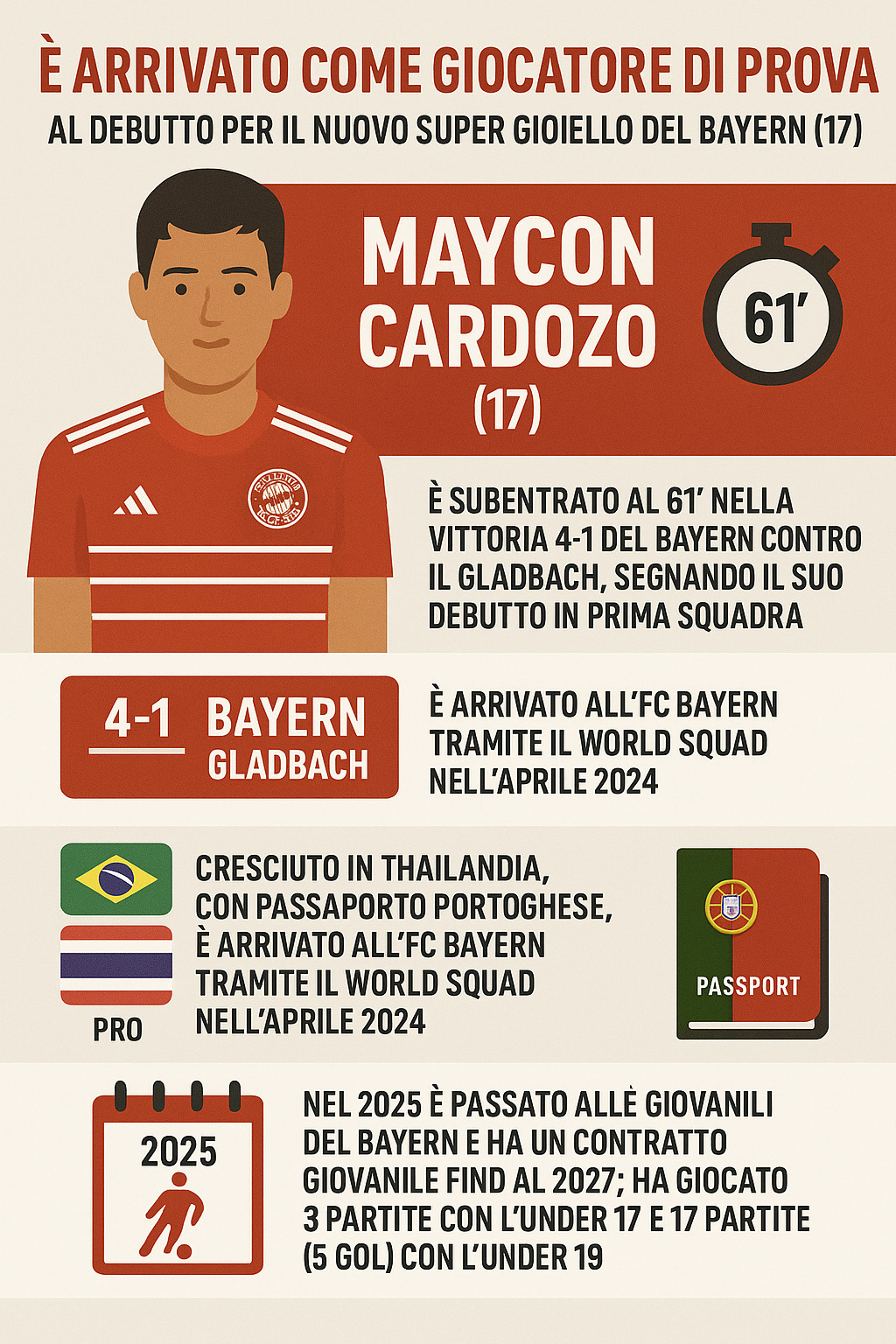 Un ragazzo di 17 anni anni corre verso la linea laterale dell’Allianz Arena. Il tabellone segna il minuto 61 e il parziale è già pesante. La partita è saldamente nelle mani del Bayern. Dalla panchina, il tecnico Vincent Kompany fa cenno: tocca a lui. Poche decine di metri dopo, il confine tra un campus giovanile e la Bundesliga viene attraversato di corsa da Maycon Cardozo. Il risultato finale dirà 4-1 contro il Borussia Mönchengladbach, ma a fine serata la notizia più grande, per il club e per il progetto di scouting globale del calcio tedesco, ha il volto di un ragazzo nato in Brasile, cresciuto in Thailandia, e con passaporto portoghese. Un filo rosso che unisce Bangkok a Monaco in meno di due anni.