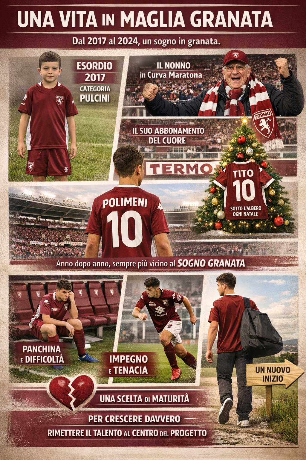 Il suo incredibile percorso parte nel 2017 con la maglia del Torino, nella categoria Pulcini. Una maglia che, con il passare degli anni, assume per Tito un significato che va ben oltre il campo. Non è semplicemente una squadra in cui giocare: è la squadra del cuore di suo nonno, quella per cui lui stesso è abbonato allo stadio, in Curva Maratona, dove canta e tifa sostenendo la squadra ogni domenica. Quella del Toro è la maglia che qualsiasi ragazzo granata sogna di indossare fin dall'asilo. È una di quelle maglie che racconti con orgoglio alla famiglia, quella che Babbo Natale ti mette sotto l’albero perché la chiedi ogni anno nella letterina, quella che fai personalizzare con il tuo nome sognando che un giorno possa diventare realtà. Passano gli anni e il percorso nel Torino continua, stagione dopo stagione, sempre più vicino a quel sogno di scrivere pagine indelebili della storia granata. Ma proprio per questo, ad un certo punto, quella maglia inizia per pesare più del previsto. Il peso di scendere in campo per la città inizia a ronzargli nella testa. L’ultima stagione, su tutte, è uno spartiacque. Il campo lo vede meno di quanto avrebbe sperato, spesso partendo dalla panchina, in un contesto in cui trovare spazio diventa complicato e in cui le gerarchie non sempre riescono ad aprire spiragli. Quando senti di poter dare di più ma non riesci a dimostrarlo, il rischio è quello di perdere fiducia. Polimeni, invece, reagisce. Continua a lavorare, aspetta il suo momento, quando chiamato in causa risponde alla grandissima, ma le cose non migliorano. Alla fine della stagione capisce che per crescere davvero serve cambiare aria. Non è una resa, ma una scelta di maturità: trovare il posto giusto per rimettere il proprio talento al centro del progetto. La chiesa al centro del villaggio.