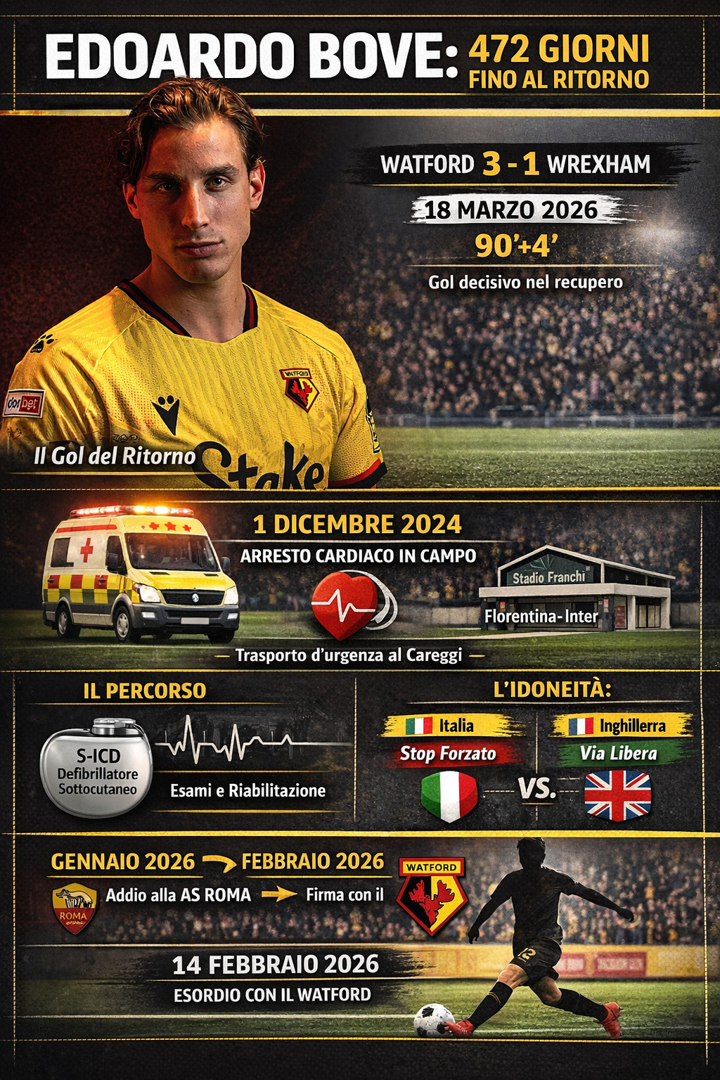 La partita è agli ultimi secondi, il tempo sta per scadere. Il pubblico trattiene il fiato, il pallone resta lì, appena fuori area. Poi arriva il tiro: destro secco di Edoardo Bove, preciso, definitivo. È il gol che chiude Watford–Wrexham sul 3–1 per gli Hornets, ma soprattutto è molto più di una rete. È il punto di arrivo di una storia lunga 472 giorni iniziata il 1° dicembre 2024, quando tutto si era fermato.