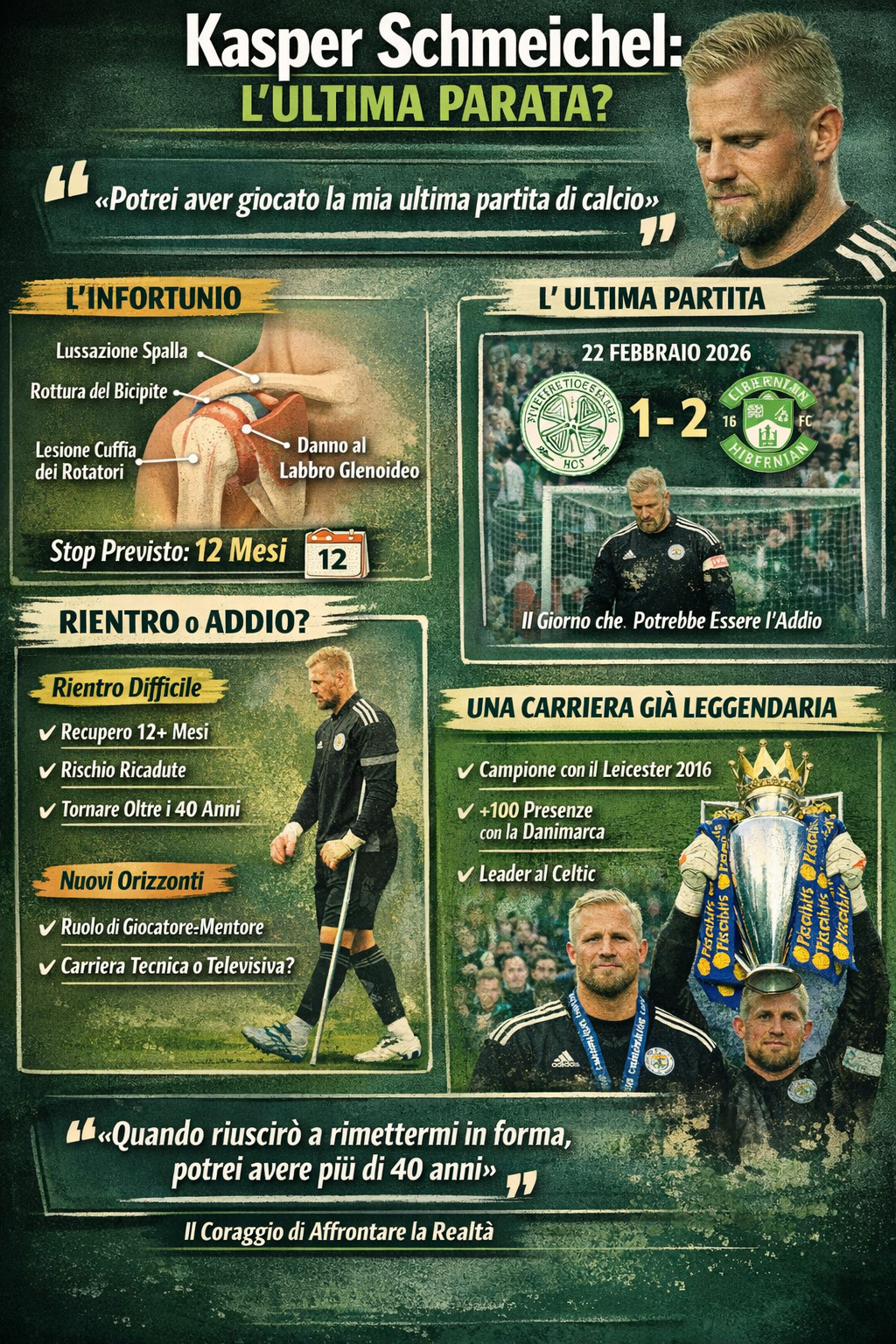 È una previsione che trova conferma nella letteratura medica, soprattutto nei casi in cui più strutture della spalla devono essere ricostruite contemporaneamente. La riparazione del labbro glenoideo, unita a quella della cuffia dei rotatori e al trattamento del bicipite, richiede tempi lunghi e un percorso riabilitativo estremamente graduale. A quasi 40 anni, inoltre, i tempi biologici si allungano: la guarigione è più lenta e il rischio di complicazioni aumenta. Il 22 febbraio 2026, giorno della sconfitta del Celtic contro l’Hibernian, assume così un significato diverso. Quella partita, inizialmente una semplice battuta d’arresto, oggi appare come l’ultima immagine agonistica di Schmeichel. A posteriori, è evidente che la condizione fisica fosse già compromessa, probabilmente oltre il limite sostenibile per competere ad alti livelli.