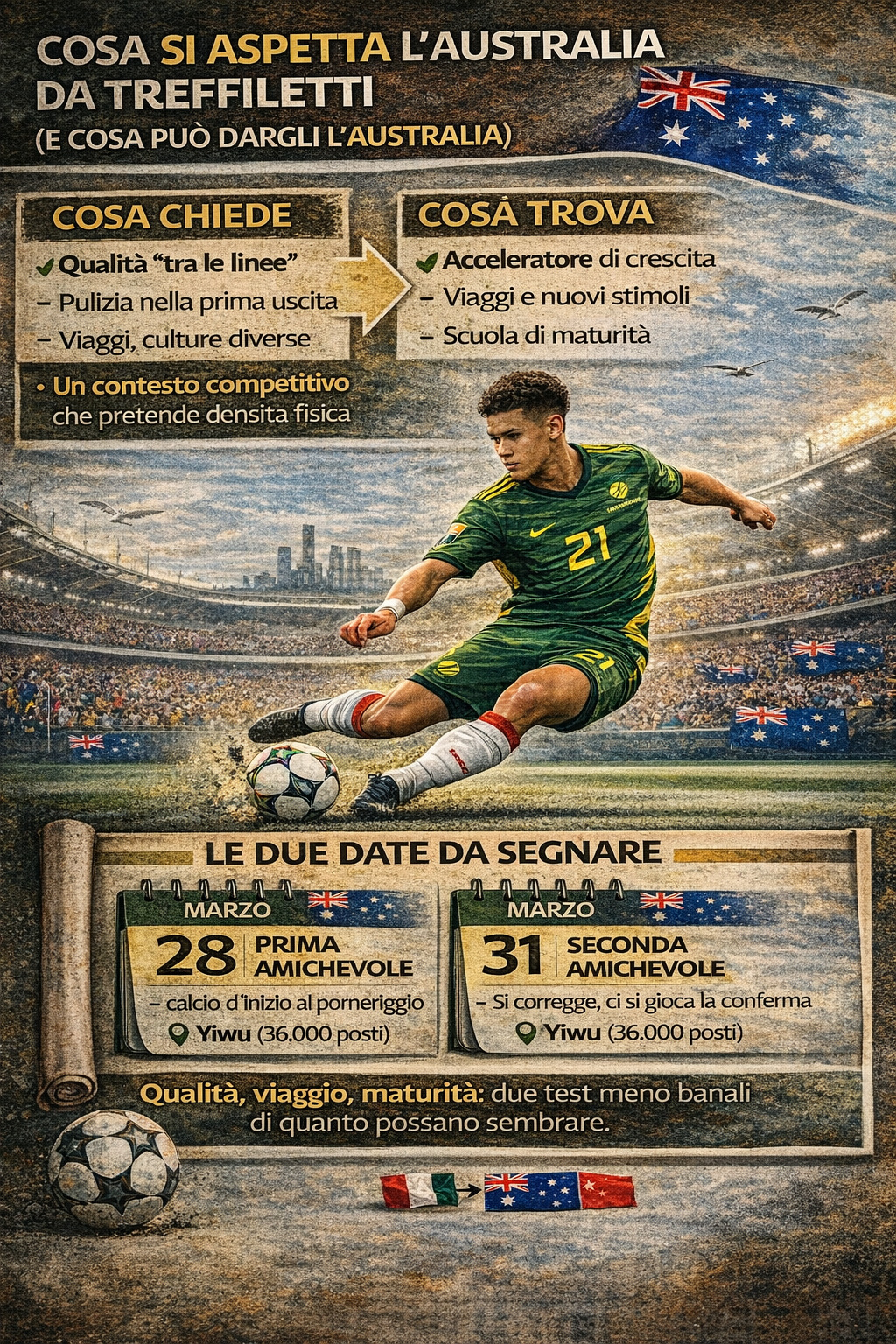 Per i lettori: la convocazione nell’Australia U20 non “chiude” in automatico le porte alla maglia azzurra. Le regole internazionali consentono, entro limiti precisi, di cambiare associazione a livello giovanile: finché non si disputa un incontro ufficiale “vincolante” in Nazionale maggiore, il dossier resta aperto. In passato Treffiletti ha già conosciuto il contesto federale di entrambe: chiamate nelle selezioni italiane giovanili e un percorso ormai consolidato con le rappresentative australiane (dagli U17/Joeys agli U20/Young Socceroos). La doppia cittadinanza è, insomma, una ricchezza tecnica e una responsabilità di scelta: più occhi addosso, più possibilità, più concorrenza.