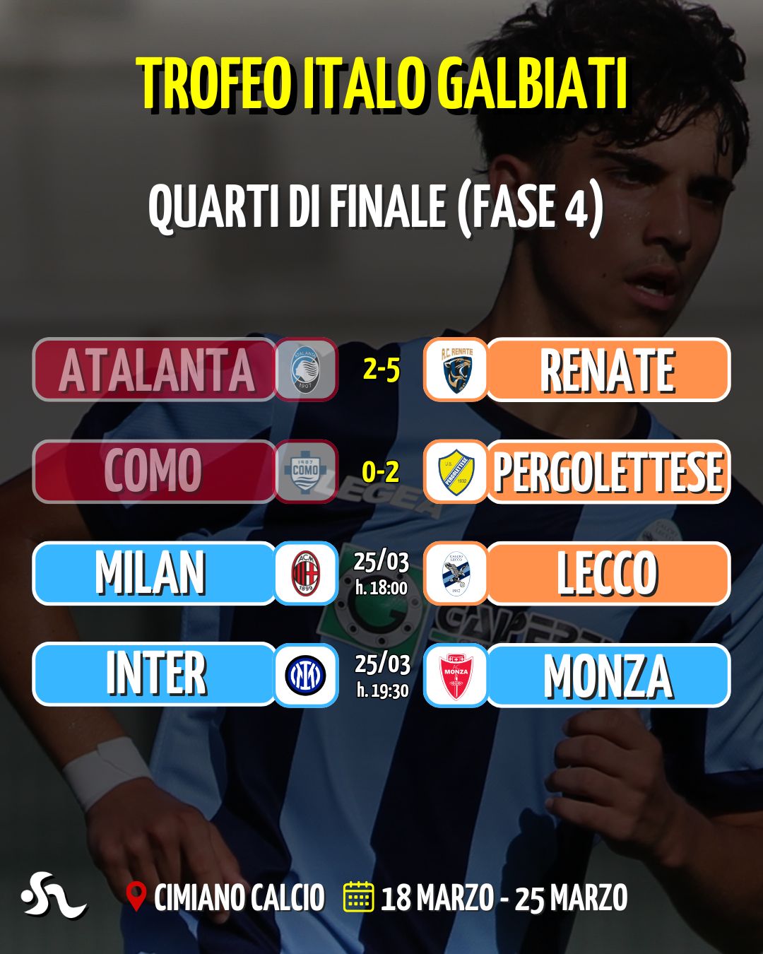 Trofeo Italo Galbiati, è ancora tempo si sognare. In quel di Cimiano continua la kermesse più importante del calcio giovanile per quanto riguarda la categoria Under 16. Questa volta (25 marzo), sul palcoscenico di via Don Giovanni Calabria 16, a Milano, scendono in campo i due colossi meneghini: Inter e Milan. Se settimana scorsa (18 marzo) Renate e Pergolettese hanno scritto in pezzo importantissimo della storia della manifestazione, battendo Atalanta e Como, accedendo alle semifinali e garantendo così un posto in finale all'universo della Serie C; ora il colpo grosso lo sognano Lecco e Monza. A seguire, tutte le date e gli orari dei restanti quarti di finale, delle semifinali e della gran finale.