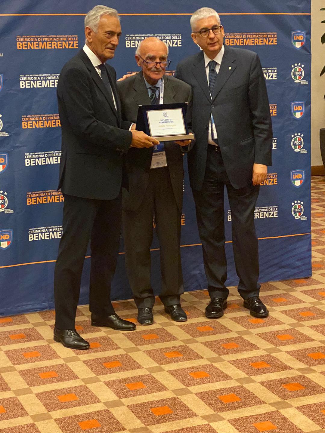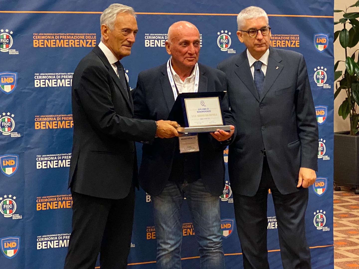 Pierangelo Isolato, Leinì Calcio, premiato dal Presidente Figc, Gabriele Gravina, e il presidente SGS, Vito Tisci