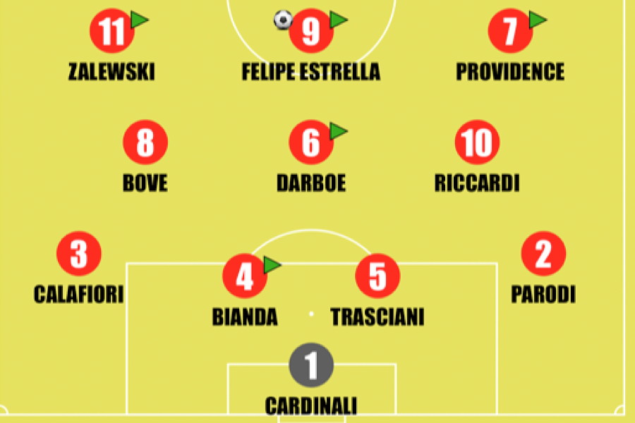 Mulattieri 6 Negativo per come si mangia il gol al 7' che avrebbe potuto cambiare le sorti del match, ma positivo perché fa vedere di essere sempre vivo e pericoloso. Nel secondo tempo va due volte vicino al gol, solo due grandi parate di Cardinali lo lasciano a secco.