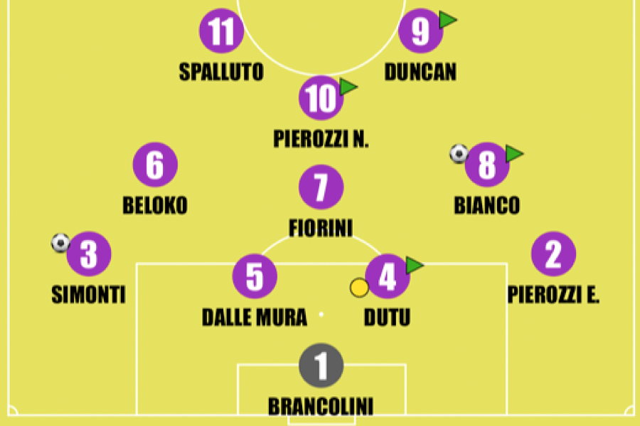 FIORENTINA (4-3-1-2): Brancolini 6.5, Pierozzi E. 6, Simonti 7.5, Dutu 6 (43' st Chiti sv), Dalle Mura 6.5, Beloko 6.5, Fiorini 6.5, Bianco 7 (25' st Hanuljak), Duncan 6.5 (25' st Kukovec 6), Pierozzi N. 6 (26' Agostinelli 6, 43' st Ponsi sv), Spalluto 6. A disp. Carcani, Marino, Fruk, Koffi, Milani. All. Bigica 7.