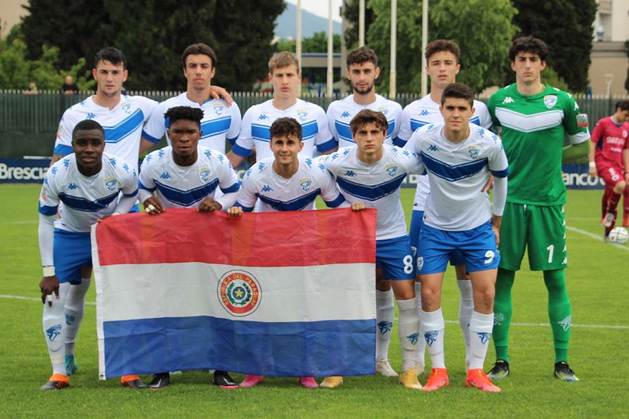 Brescia-Cittadella Primavera 2: lo schieramento iniziale del Brescia con la bandiera del Paraguay in onore del compagno Kevin Parzajuk.[/caption]