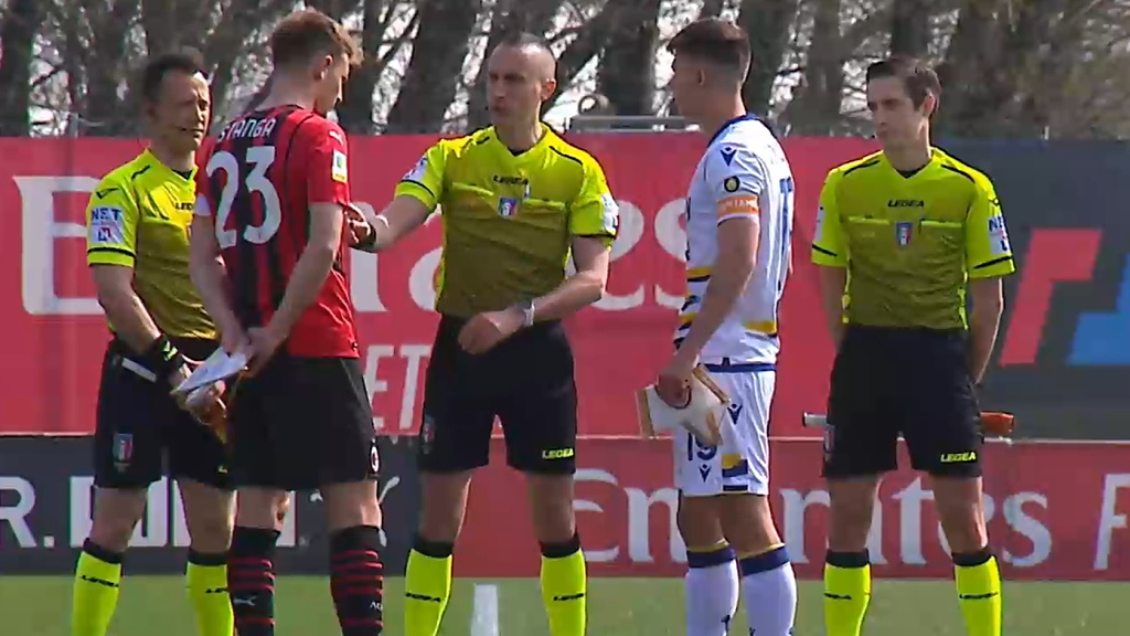 Stanga e Joselito Gomez agli ordini del direttore di gara per il sorteggio pre-partita di Milan-Verona