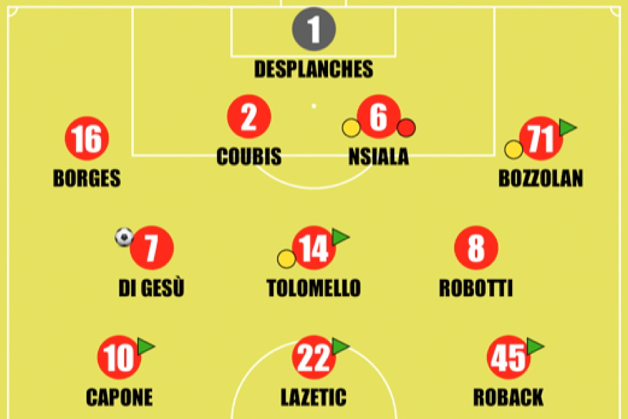 Giunti conferma il 4-3-3 ma cambia gli interpreti della linea difensiva, con Coubis spostato al centro al fianco di Nsiala per sopperire alle mancanze di Stanga e Bosisio; in mediana Tolomello centrale con Di Gesù e Robotti ai suoi fianchi; davanti "prima" da titolare per Lazetic, con Capone a destra e Roback a sinistra