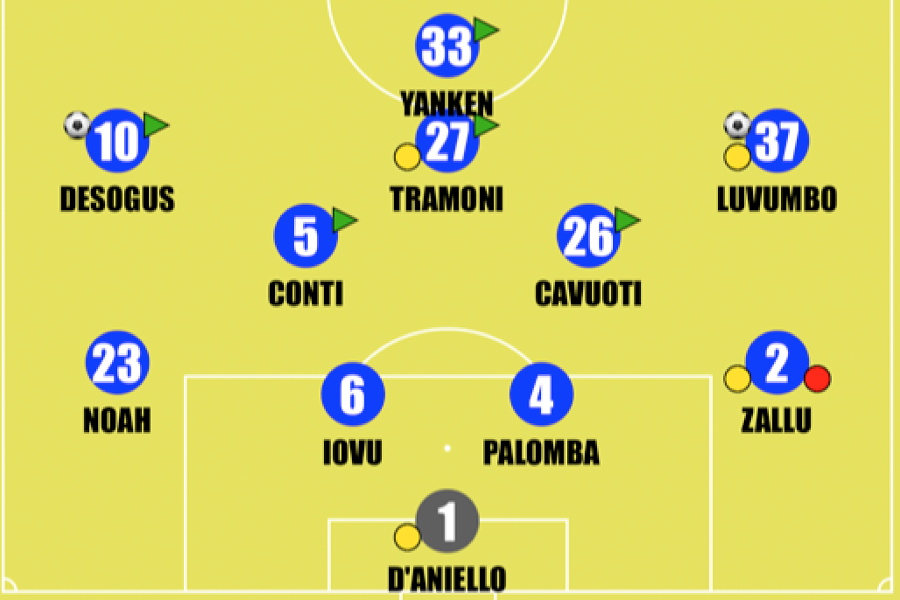 Agostini opta per il 4-2-3-1 infoltendo la linea offensiva: Yanken parte dall'inizio con Tramoni sottopunta, Luvumbo a destra e Desogus a sinistra; cerniera in mediana con Cavuoti e Conti, dietro i soliti quattro davanti a D'Aniello che torna tra i pali