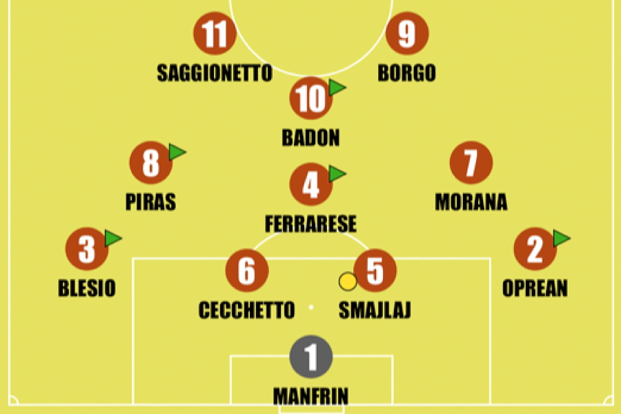 CITTADELLA (4-3-1-2): Manfrin 6, Oprean 5.5 (6' st Del Lago 6), Blesio 6 (42' st Cavalli sv), Ferrarese 5 (42' st Pierobon sv), Smajlaj 6.5, Cecchetto 6.5, Morana 6, Piras 5.5 (16' st Nalesso 5.5), Borgo 5, Badon 5 (16' st Yabre 5.5), Saggionetto 5.5. A disp. Michielin, Tarozzi, Carrettucci, Sessi, Mattia. All. Iori 5.