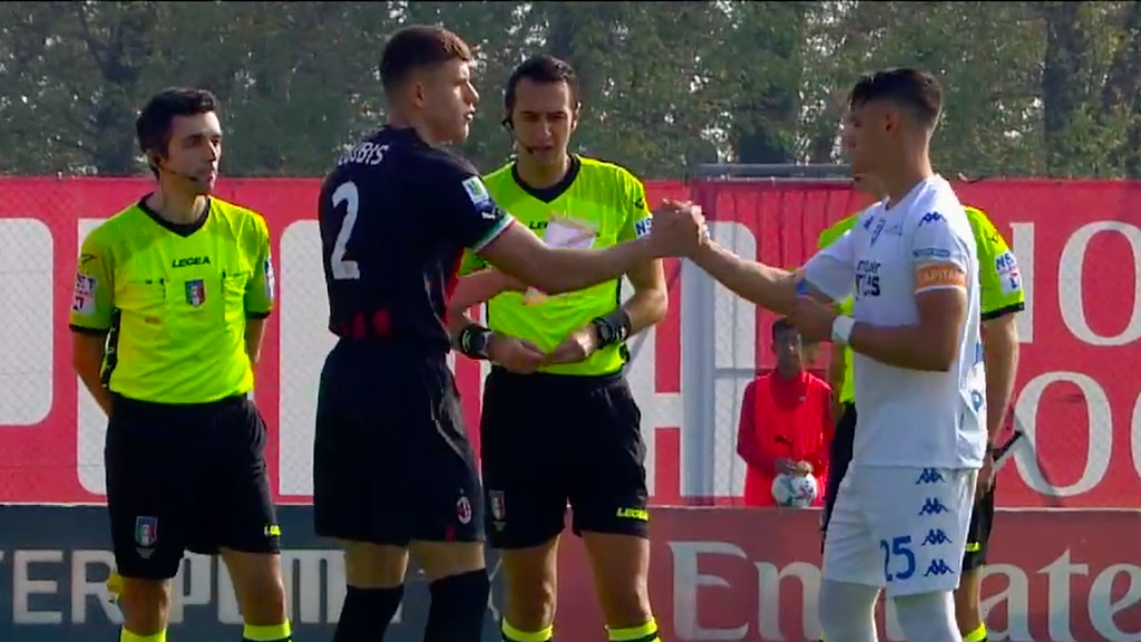 Andrei Coubis e Lorenzo Ignacchiti, capitani di Milan ed Empoli, impegnati nel sorteggio agli ordini del direttore di gara, Sfira della sezione di Pordenone
