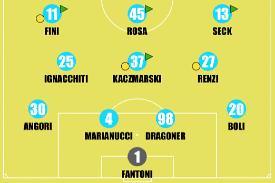 EMPOLI (4-3-3): Fantoni 7.5, Boli 6.5, Dragoner 6.5, Marianucci 6, Angori 7, Renzi 6, Kaczmarski 6 (7' st Vallarelli 6), Ignacchiti 7, Seck 5.5 (19' st Barsi 7), Rosa 6.5 (33' st Nabian sv), Fini 6 (33' st Tropea sv). A disp. Tampucci, Filippis, Sodero, Crasta, Botrini, Casadei, Ekong, El Biache. All. Buscè 6.5.