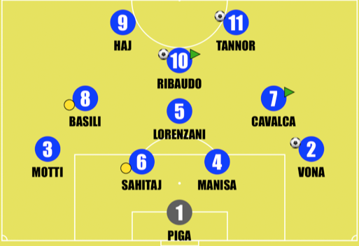 PARMA (4-3-1-2): Piga 6, Vona 7, Motti 6, Manisa 6.5, Lorenzani 6.5, Sahitaj 6, Cavalca 5.5 (14' st Mikolajewski 6.5), Basili 6.5, Haj 5.5, Ribaudo 8 (34' st Bangala sv), Tannor 7. A disp. Maliszewski, Musso, Del Bello, Annan, Flex, Rossi, Fiath, Adu-Mintah. All. Beggi 6.5.
