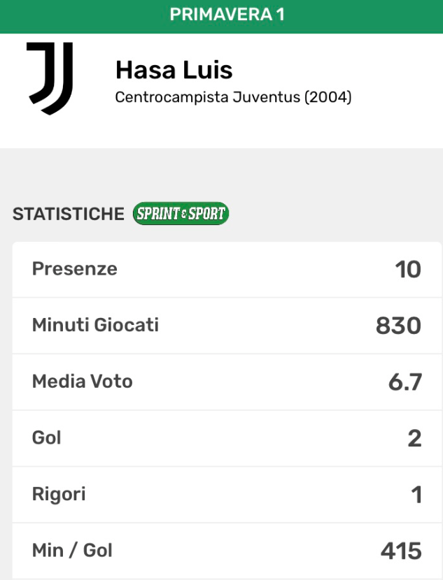 I numeri in questa stagione in campionato Primavera 1 di Luis Hasa dall'App di SprinteSport