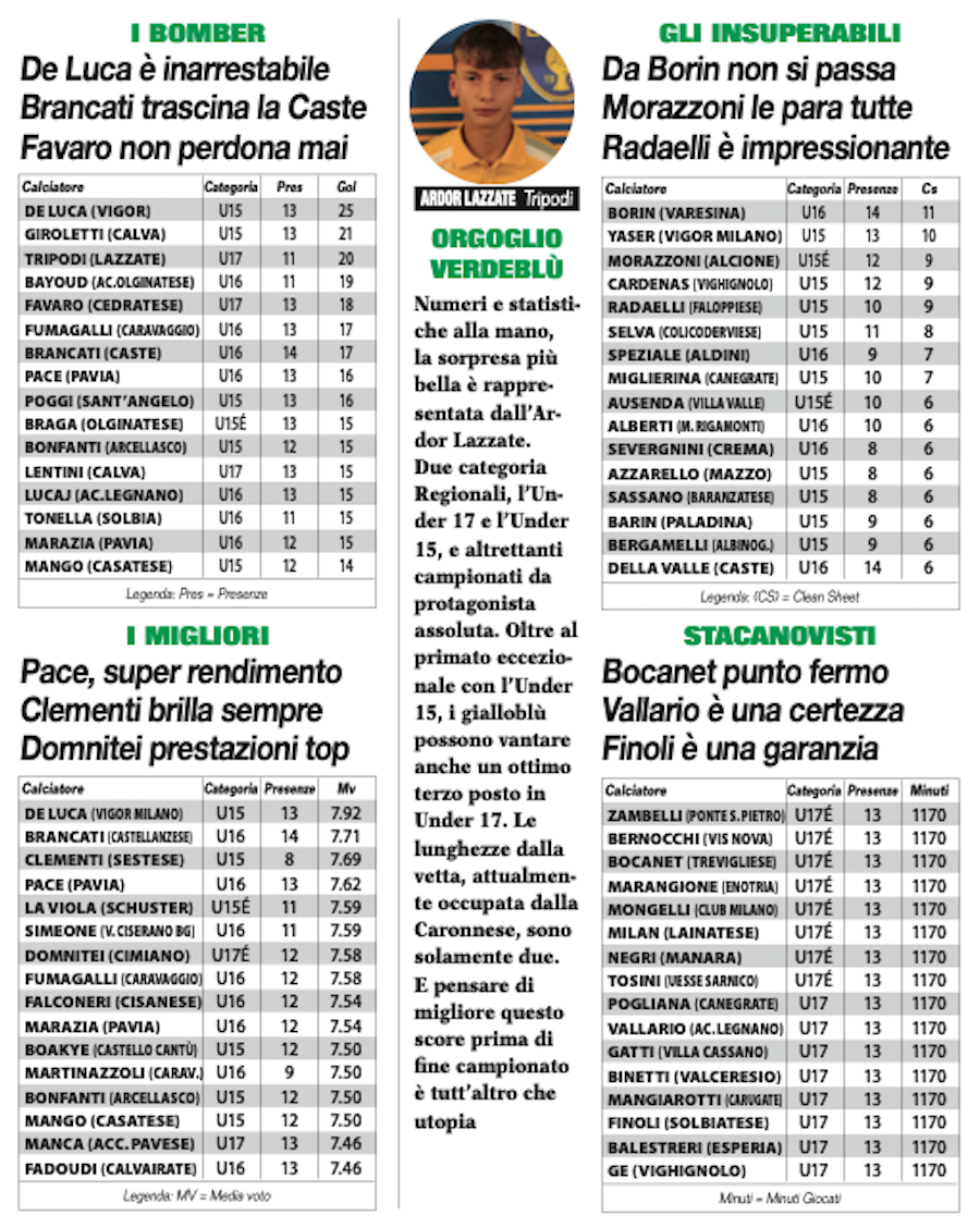 In totale sono ben 96 i punti conquistati, tre in più dell’Ausonia e sei della Castellanzese. Le due corazzate neroverdi completano dunque il podio, dal quale restano momentaneamente fuori squadre come Enotria, Alcione e Virtus Ciserano Bergamo: tre realtà che, dati alla mano, hanno tutte le carte in regola per rifarsi nel girone di ritorno. Se la classifica punti non bastasse, ecco quella che prende in considerazione la media punti. Se la prima “favorisce” chi ha tre squadre nei Regionali, la seconda non lascia indietro nessuno. O meglio, lascia indietro chi di formazioni tra i grandi ne ha solamente una. In questo caso si tratta di una media, ma anche cambiando gli addenti il risultato non cambia: l’Accademia Pavese è davanti a tutti. Nella fattispecie abbiamo escluso le società con meno di venti partite disputate, tant’è che nei primi tre posti troviamo le solite tre. Una menzione speciale la meritano anche Rozzano e Assago che, probabilmente, a inizio anno mai avrebbero immaginato di raggiungere un traguardo simile. Parlando di giocatori, impossibile non parlare del re dei bomber: De Luca della Vigor Milano. Sono 25 finora i gol messi a segno, numeri che lo rendono il migliore dell’intera regione. Da sottolineare anche il miglior portiere: Borin della Varesina, ben 11 clean sheet.