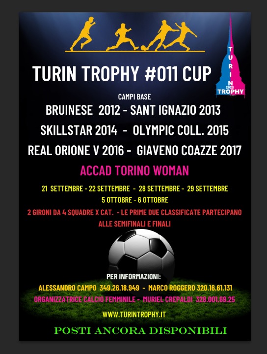 partecipanti, 680 atleti e rispettive famiglie, e conta 144 partite totali. Quest'anno il Turin Trophy ha la sua quota rosa grazie al lavoro costruttivo di Muriel Crepaldi e del suo staff. Al torneo con campo base Accademia Torino partecipano le Under 8 - Under 10 - Under 12 e Under 15 e l'esordio delle bambine e ragazze avverrà il 29 settembre e terminerà con la fase finale il 5-6 Ottobre. I campi base maschili sono stati assegnati alla Bruinese dell'amico Salvatore Leone con l'annata 2012, al Sant'Ignazio con il 2013, alla Skillstar, società di cui sono vicepresidente in collaborazione con il presidente Mauro Poloni con i 2014, l'Olympic Collegno del duo Pizzicoli-Gramuglia con l'annata 2015, al Real Orione del dg Marco Roggero (presidente come il sottoscritto del Turin Trophy) con i 2016 e la new entry (come la Bruinese) per la segretaria e responsabile del Giaveno Coazze Anika Gagliardi con i 2017».