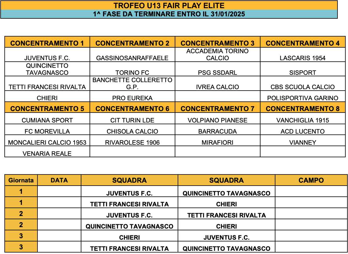 La fase autunnale dei campionati è quasi in archivio. Tempo allora di tornei federali, con in particolare l'Under 13 Fair Play Elite che è in partenza tra la fine di questo 2024 e l'inizio del 2025. Presenti tutti i gruppi top delle migliori società piemontesi, in una manifestazione che coinvolge le scuole calcio più importanti dell'intera penisola. Qui sotto i concentramenti e i primi appuntamenti di questa nuova edizione.