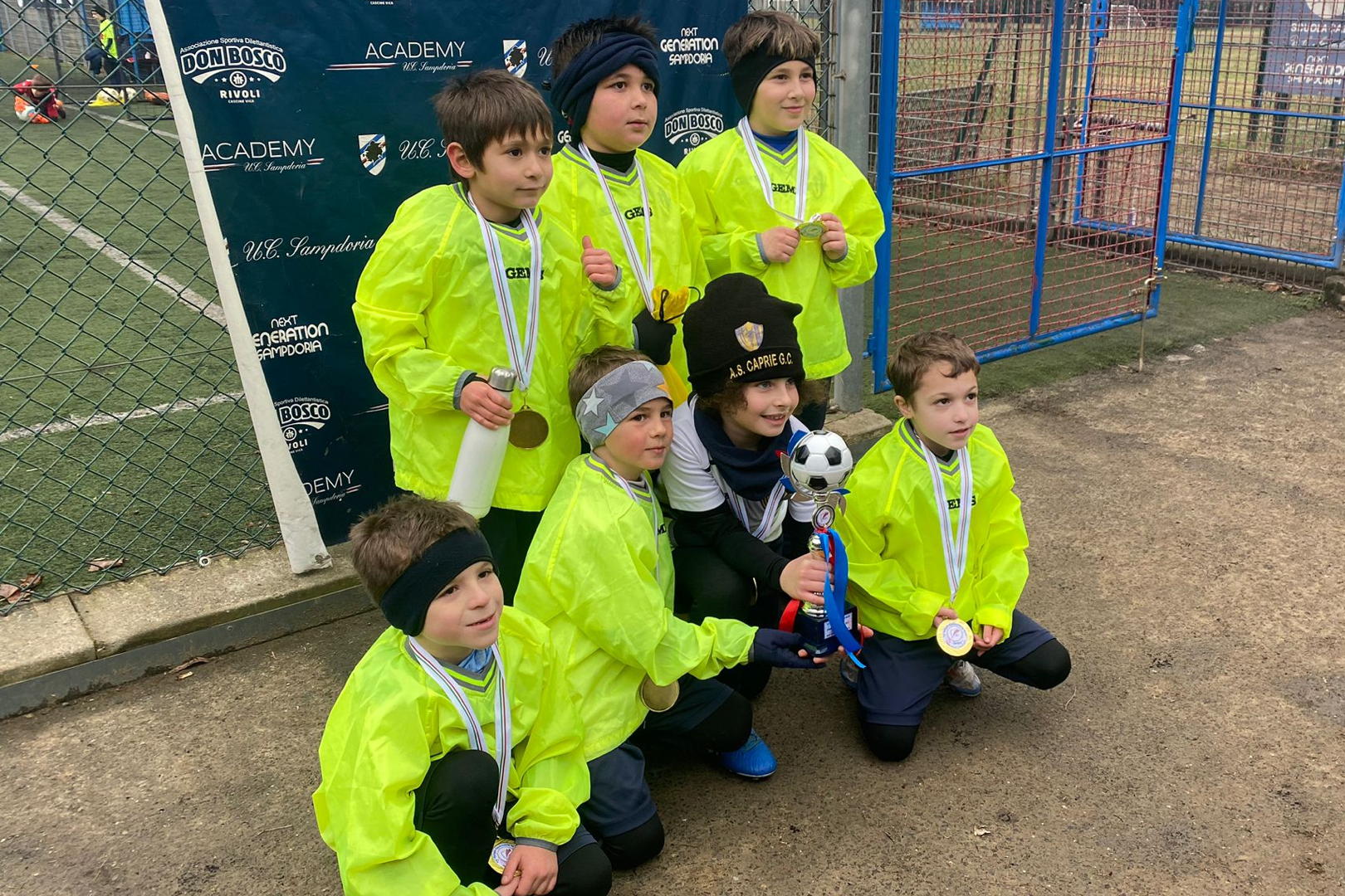 A dare il via al torneo è stata la categoria dei Primi Calci 2017, che ha visto scendere in campo il Don Bosco Rivoli (suddiviso in due gruppi: Rosso e Blu), Caprie e Tetti Francesi Rivalta. Nonostante la pioggia e il cielo coperto, l'entusiasmo dei piccoli calciatori non è venuto a mancare. La competizione si è svolta su due campi, con le partite che si sono disputate in contemporanea, divise in tre manche da due incontri ciascuna, per un totale di sei. Il primo turno ha visto, da una parte, Don Bosco Rivoli (Blu) e Caprie affrontarsi in una sfida equilibrata che si è conclusa con un giusto 3-3, e dall'altra il Tetti Francesi Rivalta avere la meglio sul Don Bosco Rivoli (Rosso) con tre reti. Nel successivo, il Don Bosco Rivoli (Blu) ha superato il Tetti Francesi Rivalta con un 5-1, ed il Caprie ha conseguito il medesimo risultato contro il Don Bosco Rivoli (Rosso). Infine, nell'ultima tranche, ancora un pareggio per il Caprie nell'incontro con il Tetti Francesi Rivalta, mentre, nel frattempo, il Don Bosco Rivoli (Blu) ha chiuso in grande andando in doppia cifra nella sfida a tinte rossoblù con l'altra squadra di casa.