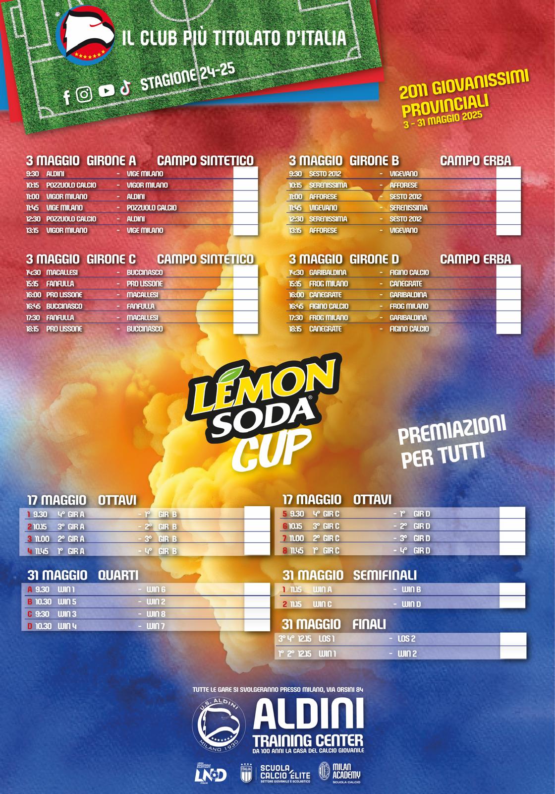 Tra equilibri, incertezze e colpi di scena il torneo "Amici dei Bambini" sta mettendo in mostra uno spettacolo unico, esprimendo ancora una volta tutta la competitività e la qualità che il calcio giovanile lombardo ha da offrire. Allora perché fermarsi qui? L'organizzazione Aldini, infatti, sta per lanciare la "Lemon Soda Cup" - in partnership con il famoso brand - torneo che vedrà affrontarsi i 2011 Giovanissimi Provinciali dal 3 al 31 maggio, sempre sul sintetico di via Orsini.