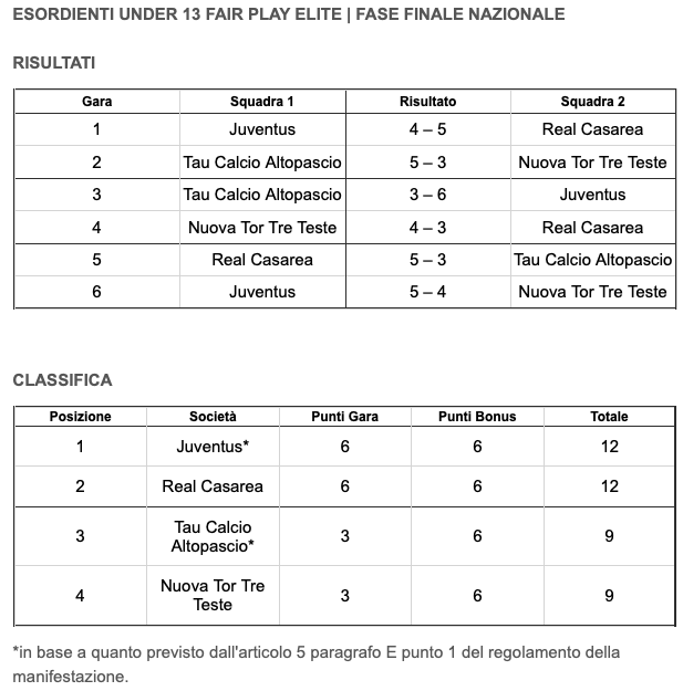Trionfo finale per la Juventus di Davide La Pira alla fase nazionale del torneo Under 13 Fair Play Elite. I bianconeri - unica società professionistica nel quartetto arrivato fino all'ultimo atto della competizione - hanno dimostrato cosa significa essere un club che lavora per costruire il domani. In mezzo a realtà prestigiose del dilettantismo italiano come Nuova Tor Tre Teste (Lazio), Real Casarea (Campania) e Tau Calcio (Toscana), i classe 2013 sottoleva della Vecchia Signora hanno alzato in maniera lampante il livello di partita in partita. La Juventus infatti, dopo aver perso all'esordio contro la Real Casarea per 5-4, ha battuto il Tau Calcio per 6-3 prima e la Nuova Tor Tre Teste per 5-4 poi, nell'ultima gara, chiudendo al primo posto con 12 punti insieme ai campani, contro cui avevano maturato un vantaggio negli scontri diretti 9vs9. Discriminante applicata anche per stabilire il terzo posto, andato al Tau Calcio davanti alla Nuova Tor Tre Teste. Di seguito il quadro completo della giornata in quel di Tirrenia.