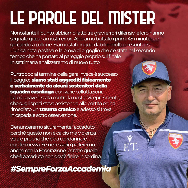 Finisce 3-3 sul campo la gara tra Centrocampo e Accademia Real Torino di Seconda categoria ma è quello di imprevedibile che succede alla fine, dopo il triplice fischio finale che lascia l'amaro in bocca a Fabio Tunno e l'Accademia Real Torino. Che con un post su Facebook descrive ciò che poi racconta poi a parole: «Senza un motivo apparente, dopo una gara recuperata dal 3-0 fino al 3-3 ma senza episodi contestati nè situazioni particolari in campo, mentre i giocatori e la squadra uscivano dal campo è scoppiato un parapiglia senza un motivo. Forse qualcuno ha detto qualcosa ed è successo qualcosa di indescrivibile. Volontariamente o meno non mi interessa ma è stata colpita con un pugno in faccia mia moglie Maria così come sono state coinvolte mia figlia Sabrina con graffi al collo e la moglie del nostro dirigente Umberto Arricale. Una cosa incredibile e fortunatamente non si è degenerato in qualcosa di peggio. Temevamo la frattura dello zigomo per mia moglie ma fortunatamente, dopo essere andati all'ospedale Maria Vittoria dove le hanno fatto una Tac, la paura è scampata e le hanno riscontrato un trauma cranico. Resta il dolore e la grande rabbia... Nelle prossime ore valuterò e valuteremo cosa fare e se sporgere denuncia».