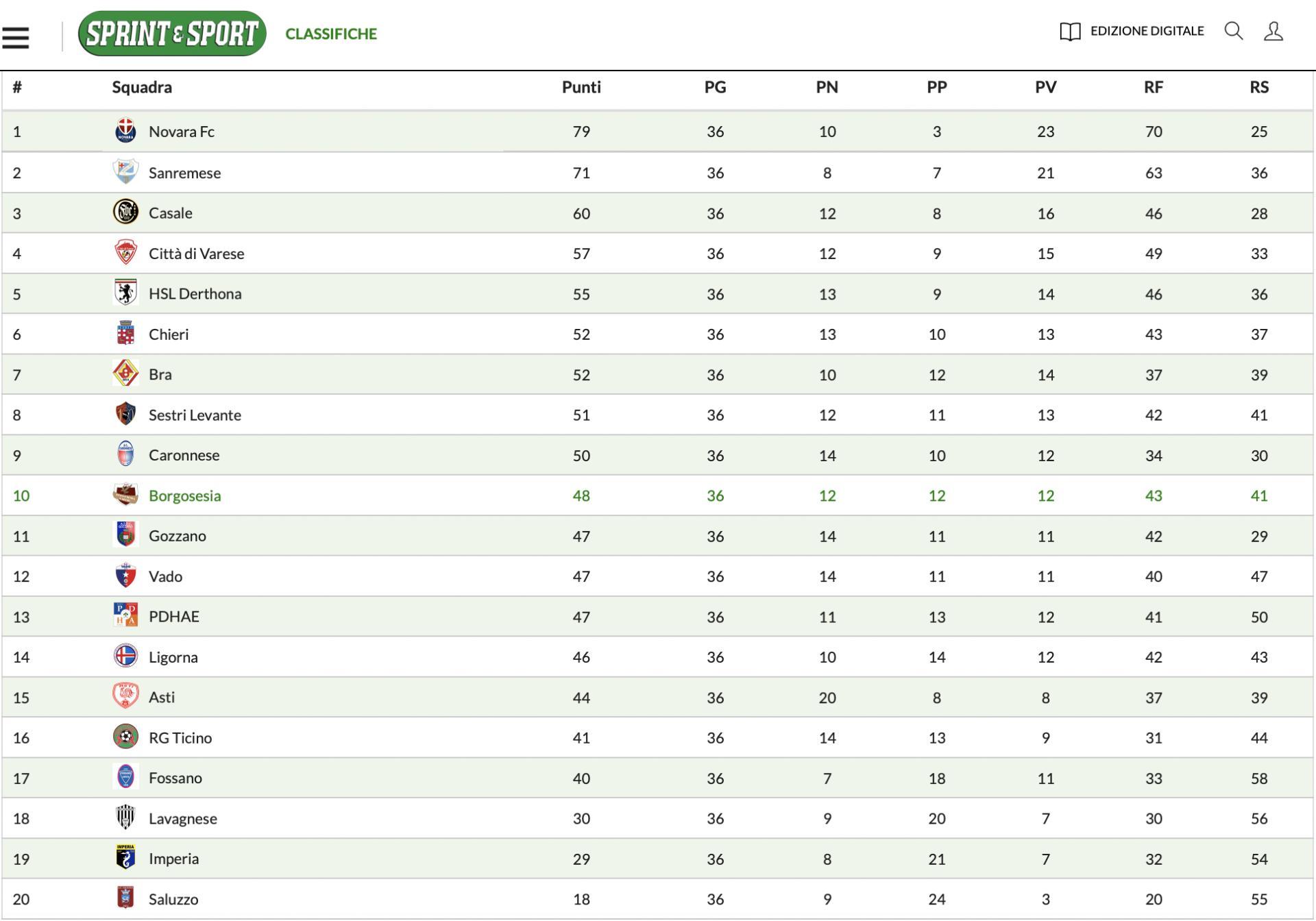 Come stimato da qualche settimana, la quota salvezza è ancora a 48 punti, ovvero dal Borgosesia in su. Tutte le squadre dai 47 punti in giù, fino al Fossano a 40, hanno ancora speranze di risalire, per chi sta in coda - vedi Fossano ed RG Ticino in primis, essendo ad oggi le due squadre a giocarsi l'ultima retrocessione al playout - e la volglia di fare 'l'ultimo metro' per chi è proprio sulla linea del traguardo - Gozzano, Vado e PDHAE a 47 punti, il Ligorna a 46 e l'Asti a 44 punti -.