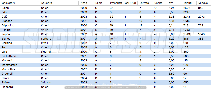 Terzo in classifica il Chieri, sempre presente sul podio del premio Giovani D valore negli ultimi tre anni. Chieri che si conferma ‘cantera’ di grande qualità portando in doppia cifra di presenze ben suoi 8 giocatori. Primo della speciale classifica interna, il centrocampista classe 2000 Balan, con 36 presenze e all’attivo 3 reti in stagione. Stesso numero di presenze, 36, per il giovane portiere classe 2003 di scuola Torino, Edo mentre a 32 presenze l’altro classe 2003, difensore, Calò. A quota 29 presenze il difensore 2001 Ciccone mentre a quota 19 presenze il centrocampista classe 2000 D’Ippolito. A quota 18 invece il difensore esterno classe 2001 Renolfi, a cui però, nella stagione, andrebbero sommate le 5 presenze fatte al Gozzano prima di approdare al Chieri (per un totale di 23 presenze in stagione). 16 invece le presenze per l’attaccante classe 2002 Poppa e a chiudere i ‘magnifici otto’ in doppia cifra di presenze in campionato, ecco Bianco, attaccante classe 2001, ora al Borgaro in Eccellenza, che prima della sua partenza aveva all’attivo 10 presenze in stagione.