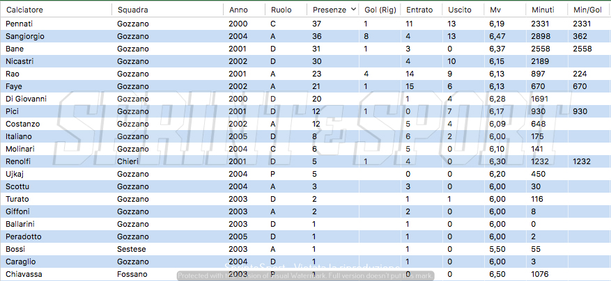 Prima della classe il Gozzano che, statistiche alla mano (statistiche esclusive di SprinteSport) ha ben suoi quattro ragazzi con oltre 30 presenze (su 37 giornate giocate) e 12 giocatori in ‘doppia cifra’ di presenze. A guidare la speciale classifica ‘interna’ il 2000 Pennati, sempre in campo in tutte e 37 le gare della stagione regolare. Seguito con 36 presenze dal golden-boy classe 2004, convocato anche nella Rapp di serie D al Viareggio e nella nazionale Lnd Under 18, Sangiorgio. Seguono poi il difensore classe 2001 Bane con 31 presenze e il difensore Nicastri, classe 2002, con 30 presenze. In doppia cifra di presenze l’attaccante classe 2001 Rao con 23 presenze, l’attaccante classe 2002 Faye con 21 presenze e il difensore classe 2000 Di Giovanni con 20 candeline. Chiudono in doppia cifra anche il difensore classe 2001 Pici e l’attaccante 2002 Costanzo, entrambi con 12 presenze.