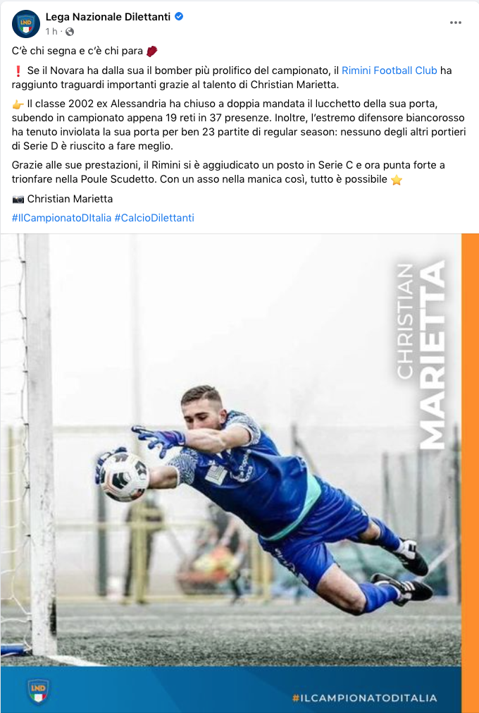 Il post a lui dedicato dalla Lnd, la Lega Nazionale Dilettanti, è il meritato e più che giusto riconoscimento ad un ragazzo e ad un ruolo troppo spesso messo in croce: il portiere. La storia è una splendida favola calcistica, sportiva e di vita. Quella di Christian Marietta, estremo difensore classe 2002, nato a Ciriè, paese alle porte di Torino che a Rimini ha fatto miracoli, mettendo le mani sulla Serie C ‘riconquistata’ dal club biancorosso a suon di record e che ora punta al titolo di Campione d’Italia di Serie D. Suo infatti il record stagionale, in tutta la Serie D, di clean-sheet, ovvero le gare senza subire gol: ben 23 su 37 presenze!