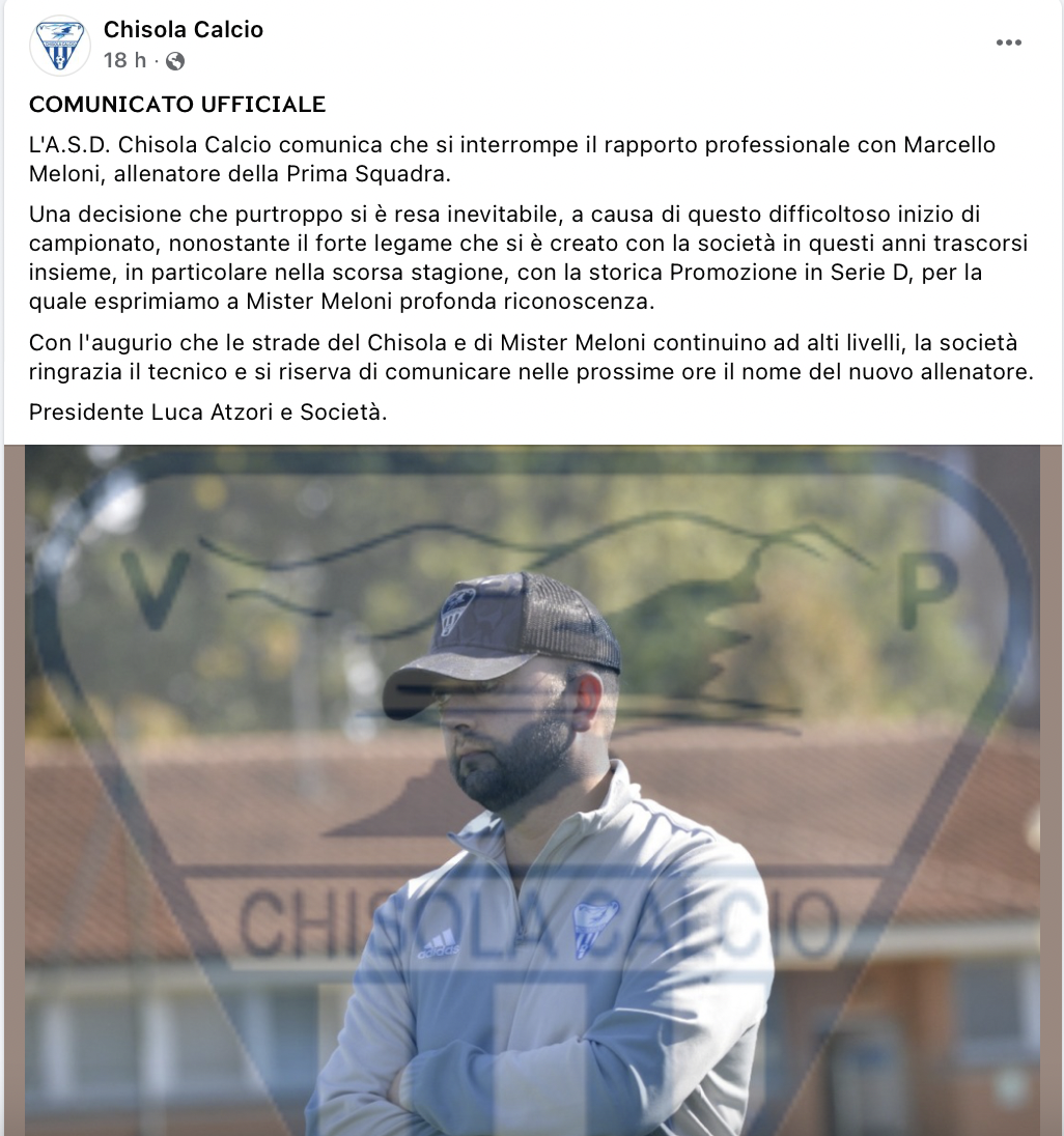 Una cavalcata da sogno e per la storia alla conquista della prima e storica Serie D per il Chisola che vive una pagina ‘dolorosa ma necessaria’ dice il Presidente Luca Atzori dopo la decisione di esonerare Marcello Meloni, il tecnico di quella fantastica avventura, e affidare la squadra a Fabio Nisticò, curiosamente il predecessore di Meloni, già al Chisola nel 2019-2020 quando vinse una Coppa Eccellenza a Novarello contro il Baveno. Finisce così, dopo 11 giornate, 6 punti frutto di 1 vittoria e tre pareggi con 7 sconfitte, 9 gol fatti e 22 subiti il percorso di Meloni in Serie D col Chisola dopo la splendida stagione 2021-2022 che aveva portato, dopo la cavalcata nei playoff, alla conquista per la prima volta nella storia del club, la massima categoria dilettantistica d'Italia..