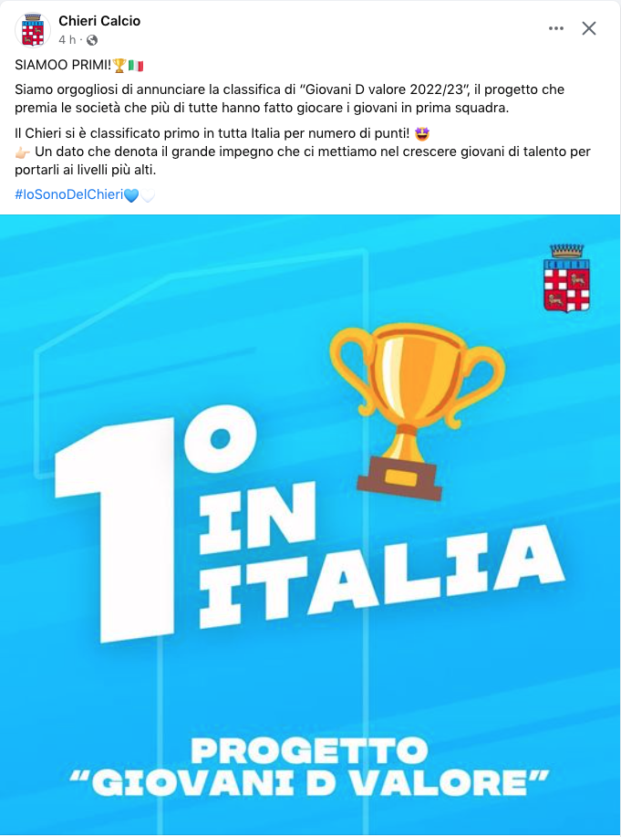 L'annuncio social del Chieri e la soddisfazione per il 1° posto nella graduatoria del Premio Giovani D Valore