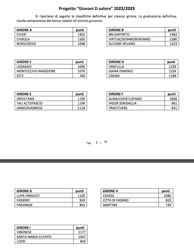 Un doppio successo per il Chieri che, mantenuta la categoria sul campo (ricordiamo che la classifica e il premio non tengono in considerazione le squadre retrocesse) non ha soltanto vinto la graduatoria dei Giovani D Valore del proprio Girone (il Girone A, ndr) ma il bottino fatto registrare di ben 1925 punti, rappresenta il punteggio più alto fatto registrare in tutta Italia! Nel Girone F l’Alma Fano si è ‘fermata’ a 1666 punti, nel Girone B il Brusaporto a 1482 punti e poi a seguire il Fanfulla con 1239 punti nel Giorne D con le altre prime classificate a superare di poco i 1000 punti.