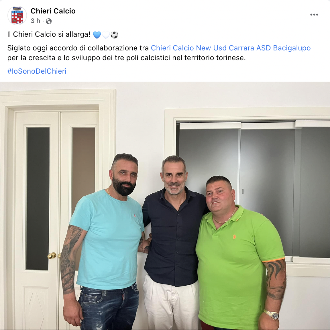 «Il Chieri Calcio si allarga! Siglato oggi accordo di collaborazione tra Chieri Calcio New Usd Carrara ASD Bacigalupo per la crescita e lo sviluppo dei tre poli calcistici nel territorio torinese».