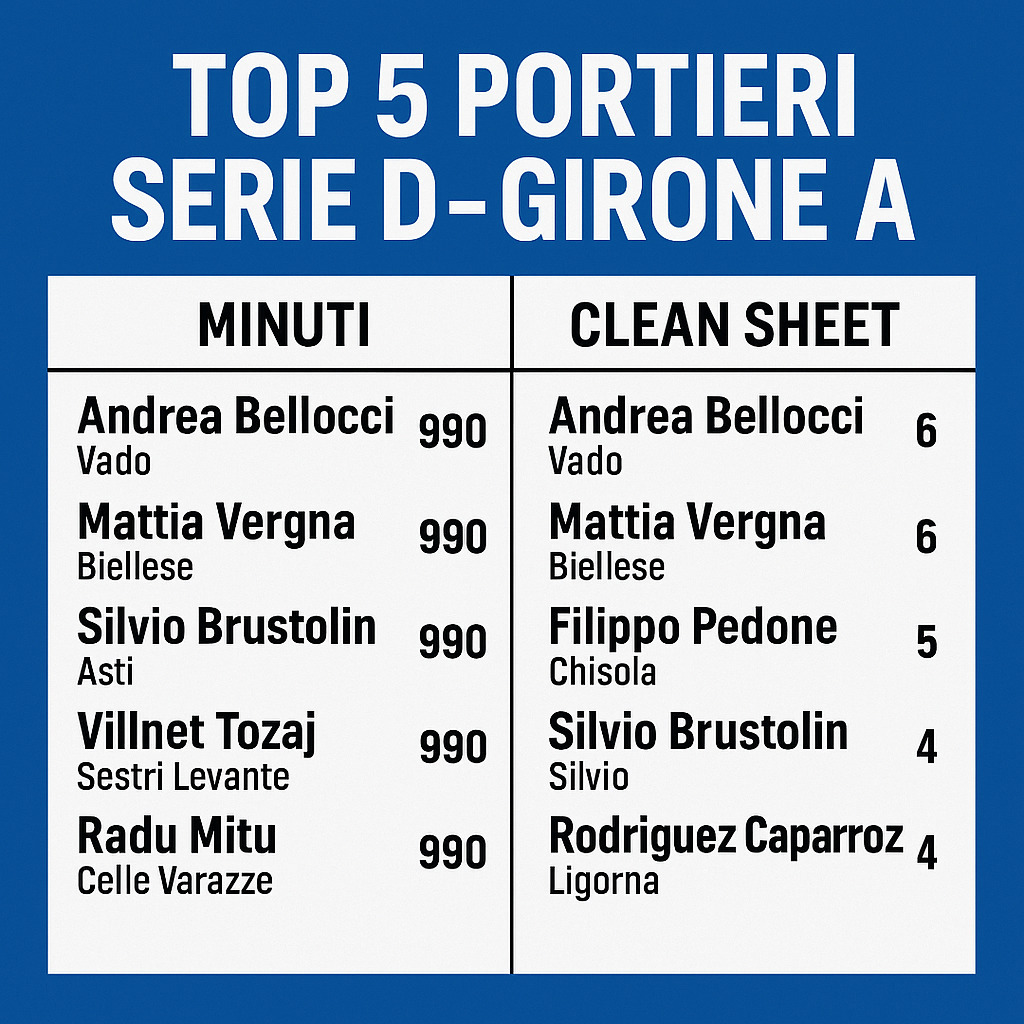 - Vado e Biellese: due portieri giovanissimi (2006) sempre in campo e con 6 porte inviolate a testa. Questo suggerisce difese molto organizzate e un portiere già affidabile in categoria.
