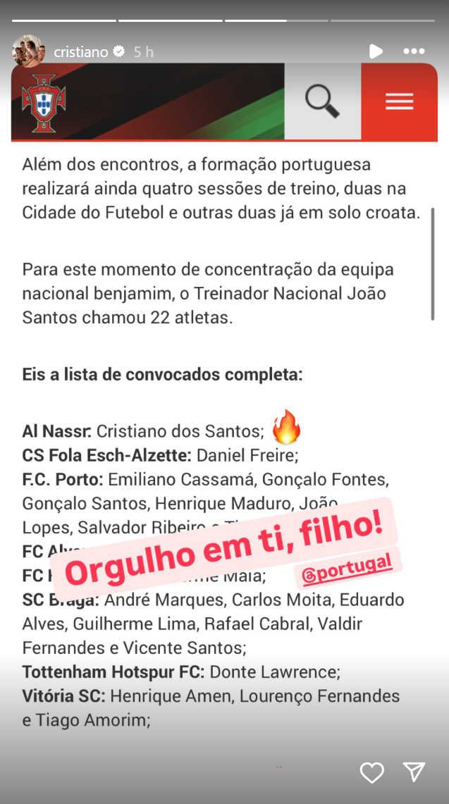 Da padre in figlio. La tradizione continua: sulla lista dei 22 convocati della Nazionale portoghese Under 15 per il Torneo internazionale Vlatko Markovic figura un nome illustre, quello di Cristiano Ronaldo Jr, ovviamente figlio del super campione ex Real Madrid, Juventus e Manchester United. Come suo papà, anche Cristiano dos Santos milita nelle giovanili dell'Al Nassr, in Arabia Saudita. Una notizia che Ronaldo ha commentato così sui propri canali social: «Fiero di te, figliolo».