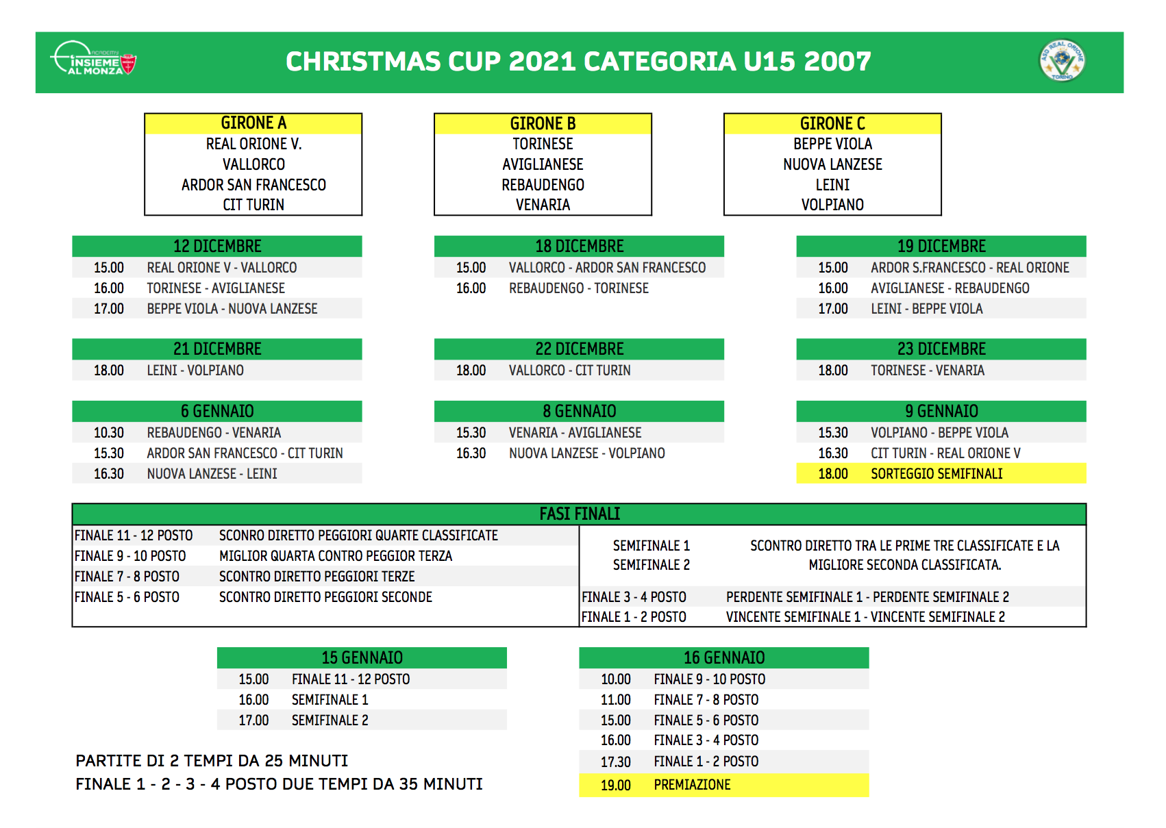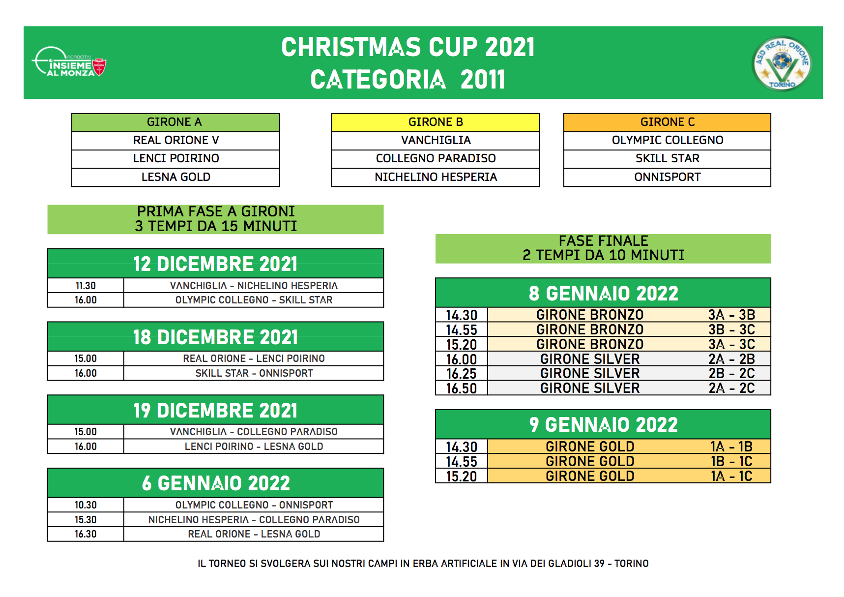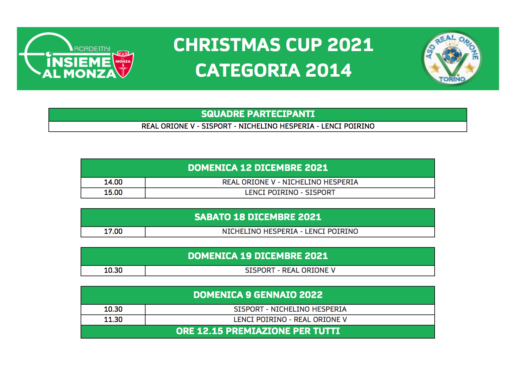Nell’ottica di rinnovamento e rafforzamento societario e programmatico, feste natalizie all’insegna del divertimento in via dei Gladioli ‘casa Real Orione V.’. In campo infatti la ‘Christmas Cup’ con impegnate ben tre categorie. A partire dall’Under 15, per passare ai Pulcini 2011 fino ad arrivare ai Primi Calci con i nati nel 2014. Fasi eliminatorie e prime fasi in pieno svolgimento e giornate con le gare finali fissate il 9 gennaio 2022 per le due categorie di Scuola Calcio, i Pulcini 2011 e i Primi Calci 2014. Ultima tappa il 16 gennaio con le finali della categoria Under 15.