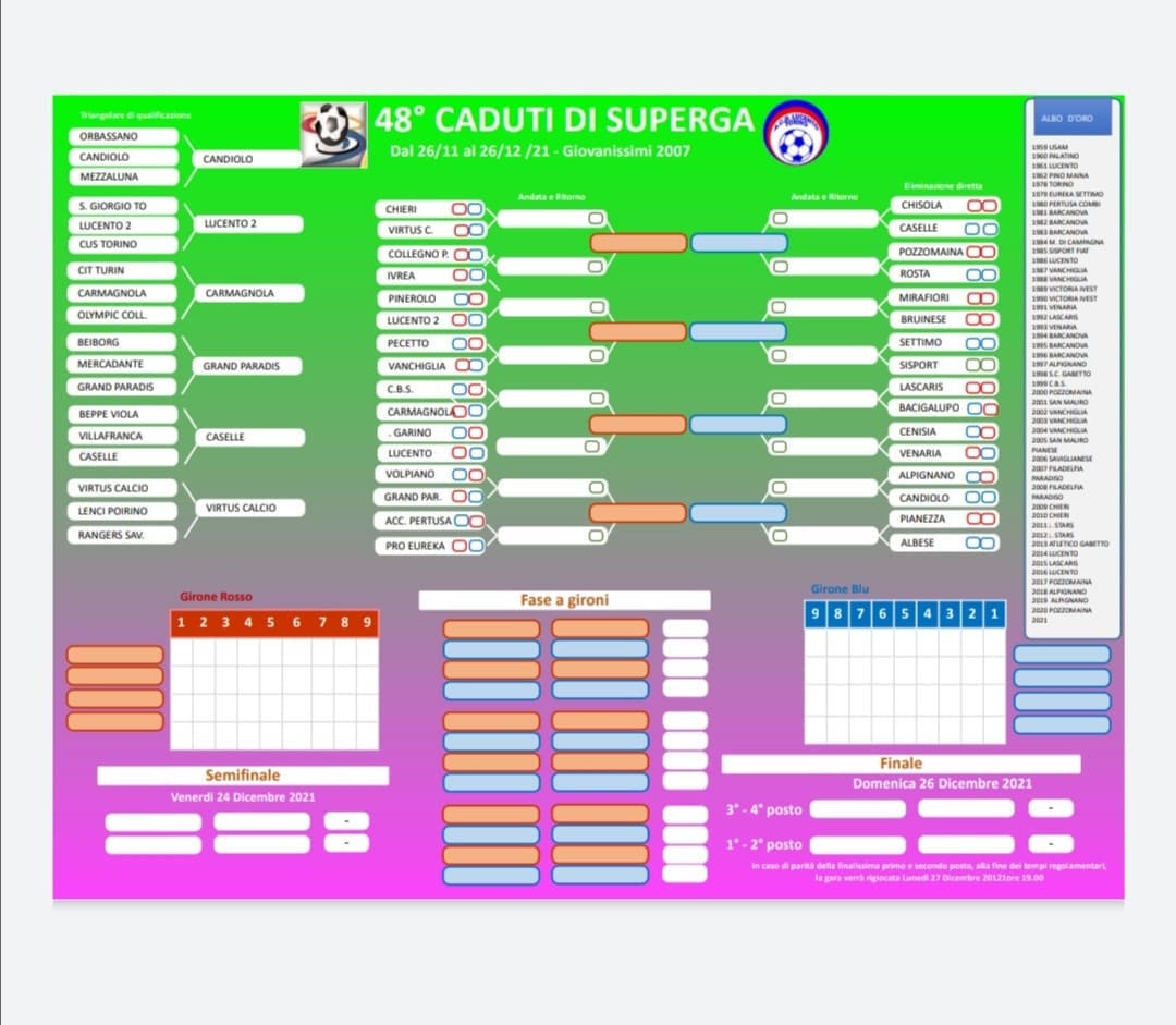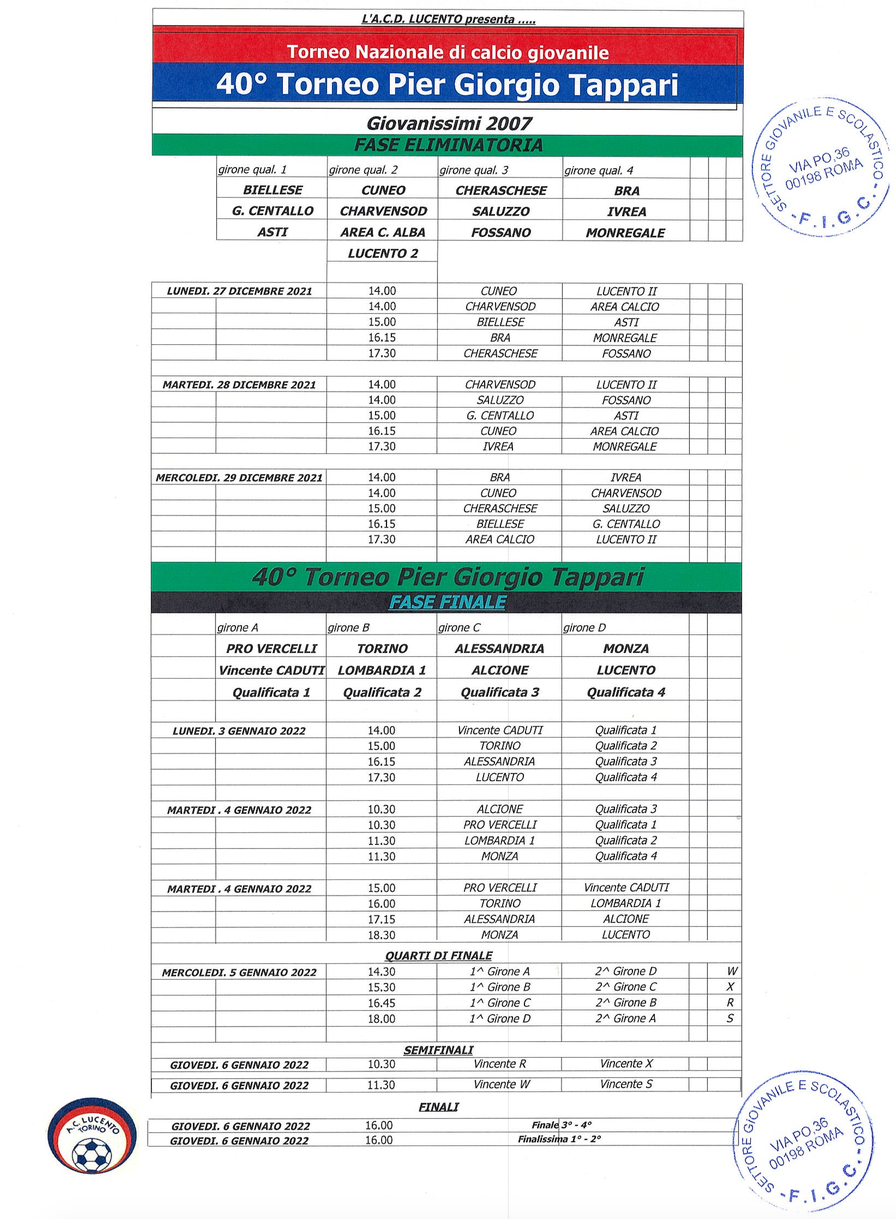 Torna nella sua ‘collocazione classica’ lo storico e tradizionale appuntamento col ‘Caduti di Superga’ e il ‘Pier Giorgio Tappari’, i tornei-gioiello di casa Lucento. Non solo Under 15 in campo (la categoria tradizionale interessata dal Caduti e dal Tappari) ma tante ‘Special Edition’ per tutte le altre categorie in campo: 2005, 2006, 2008 e 2009. Appuntamento tradizionale per tutti gli appassionati: da segnare sul calendario la giornata del 26 dicembre con tutte le finali tranne il 2007 (finale il 30 dicembre). E poi dal 27 dicembre al 6 gennaio, l’elite tutta al Torneo Tappari.