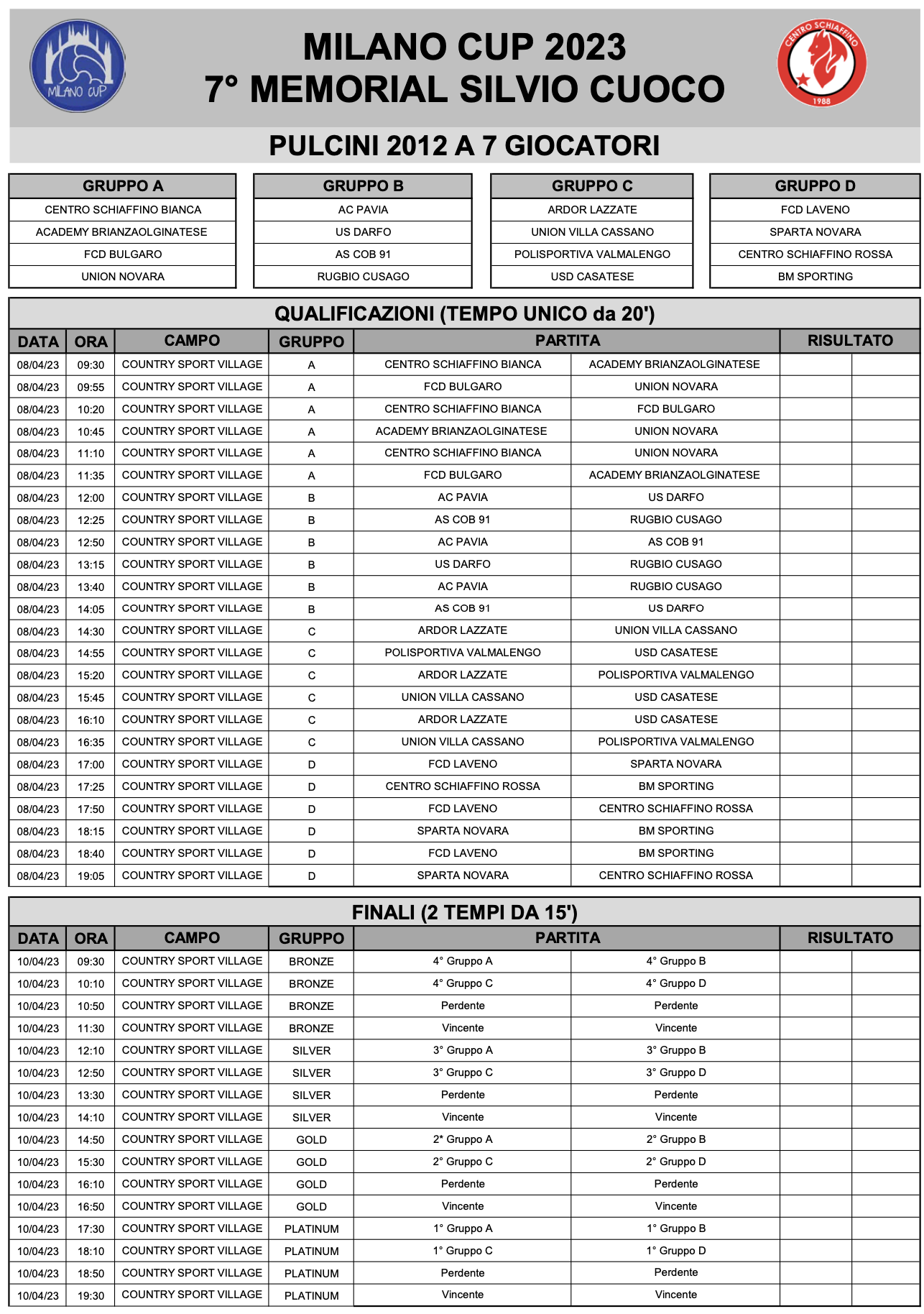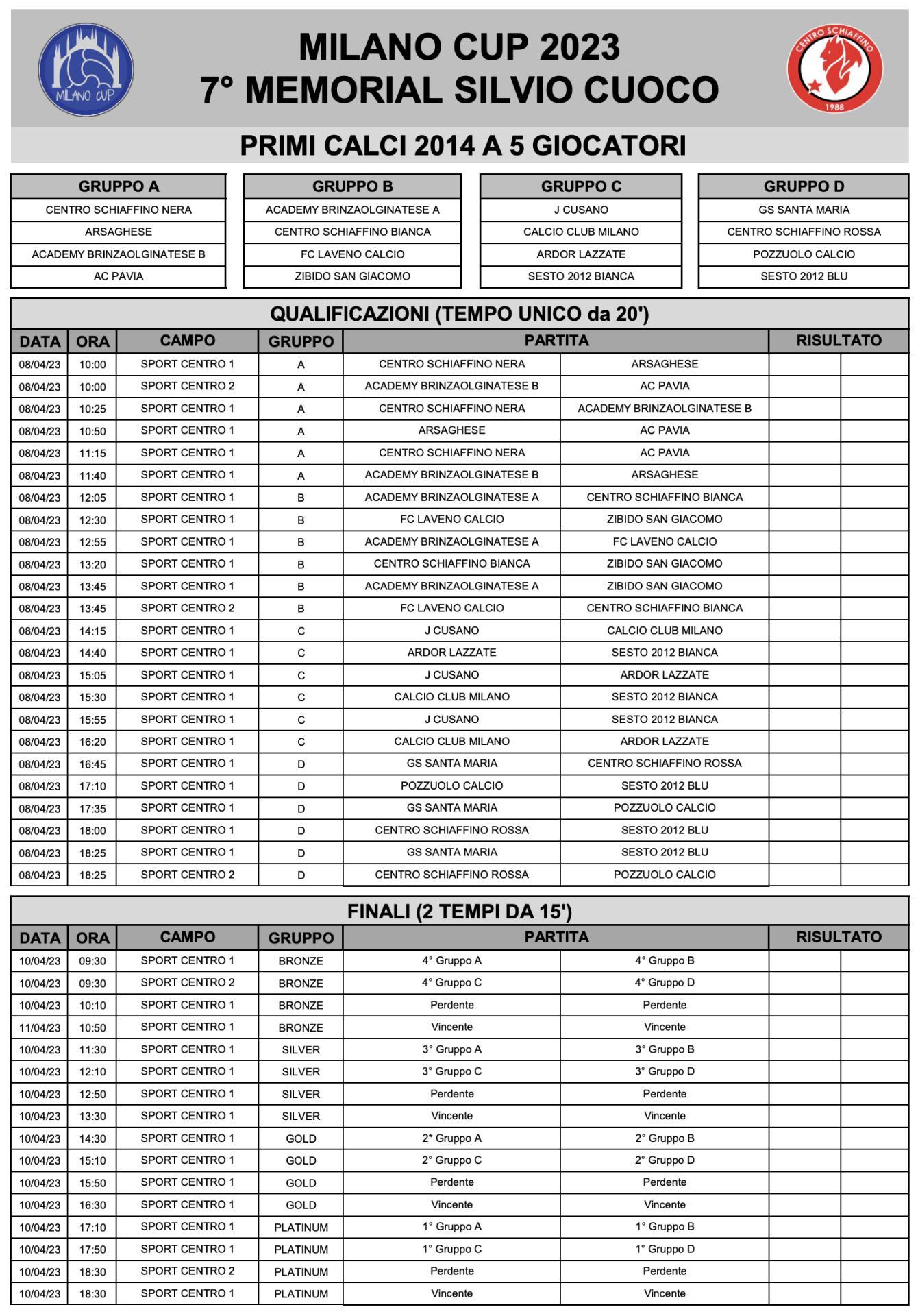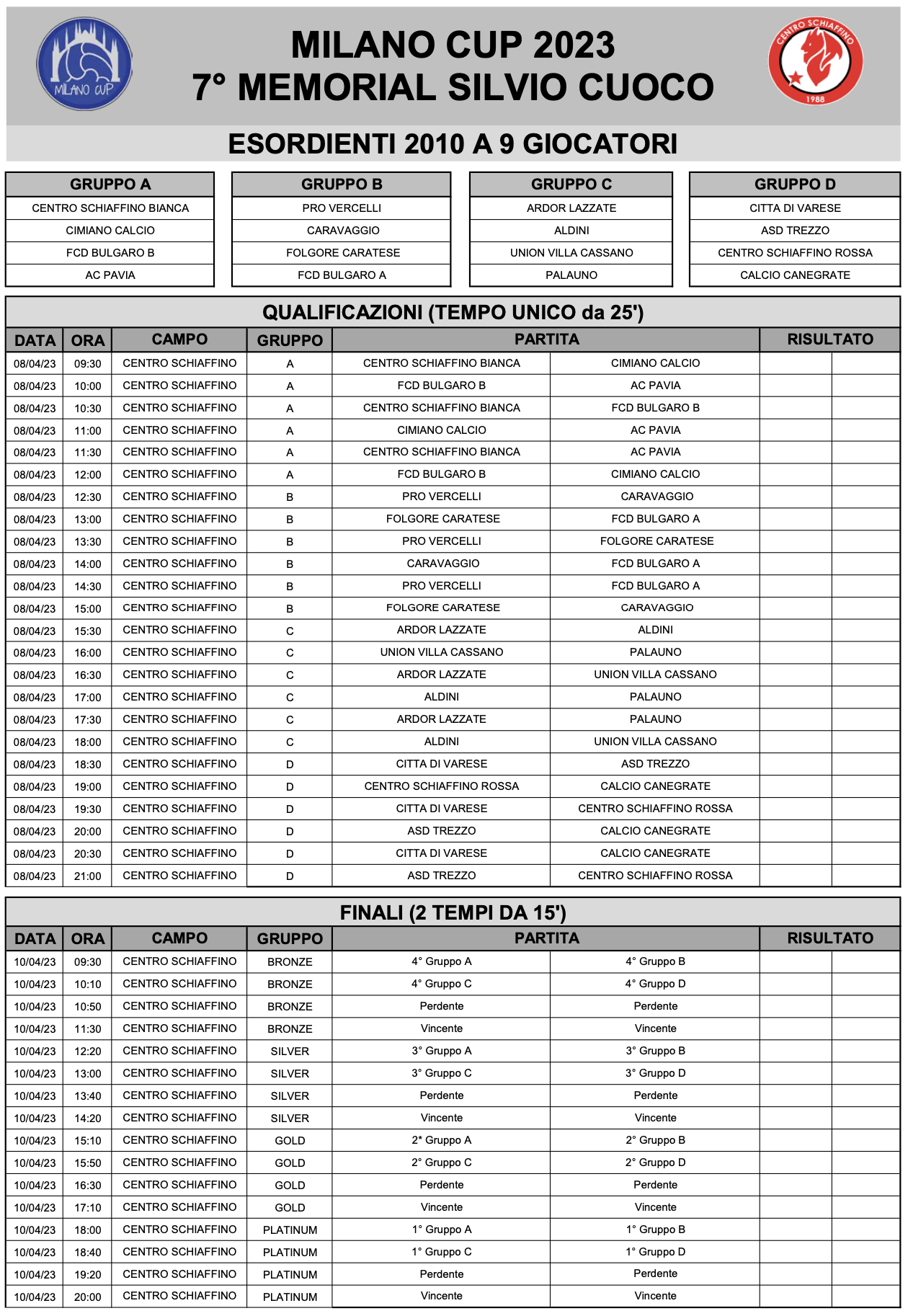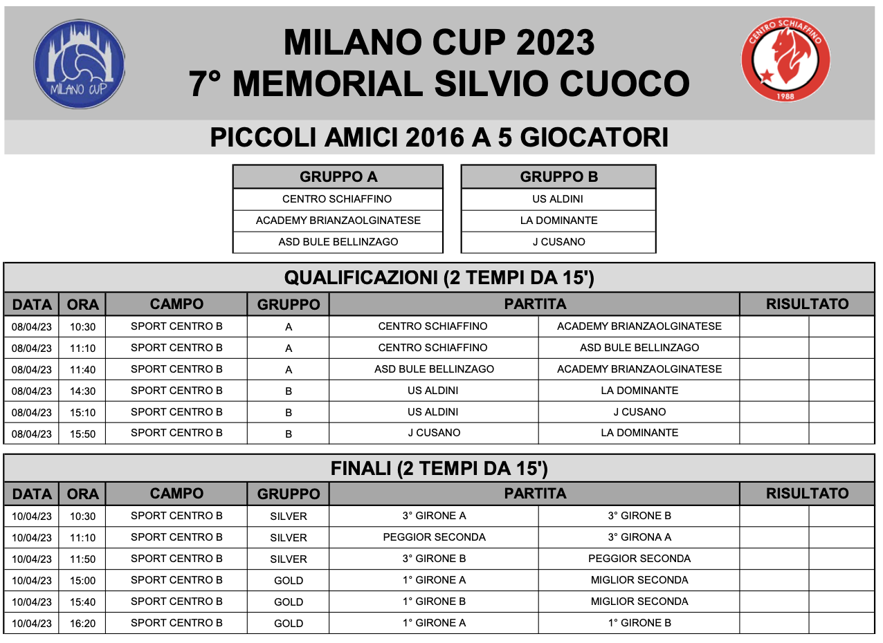 Finalmente ci siamo! La Pasqua sta arrivando, e come ogni anno in questo periodo scade il count down per uno dei tornei più belli, attesi e appassionanti della Lombardia. Sabato e lunedì, infatti, a Paderno Dugnano va in scena la Milano Cup: organizzata come sempre dal Centro Schiaffino, è arrivata alla 7ª edizione e promette anche stavolta di regalare tanto spettacolo e divertimento. Quattro categorie, 54 squadre iscritte, più di 100 partite da disputare e tutto in memoria di un grande dirigente, Silvio Cuoco, scomparso tragicamente ormai 9 anni fa in un incidente stradale. Quel maledetto lunedì 11 agosto del 2014 è ancora scolpito nel cuore e nella mente di tutto il calcio lombardo. Il dirigente del Como e uno dei primi artefici del miracolo Canzese, portata fino alla Serie C2 di allora, è stato anche direttore sportivo dello Schiaffino lasciando ovviamente un ricordo indelebile. Un ricordo che le squadre in campo onoreranno nel migliore dei modi, come sempre è stato in un torneo che si è sempre svolto all'insegna del calcio e del fairplay.