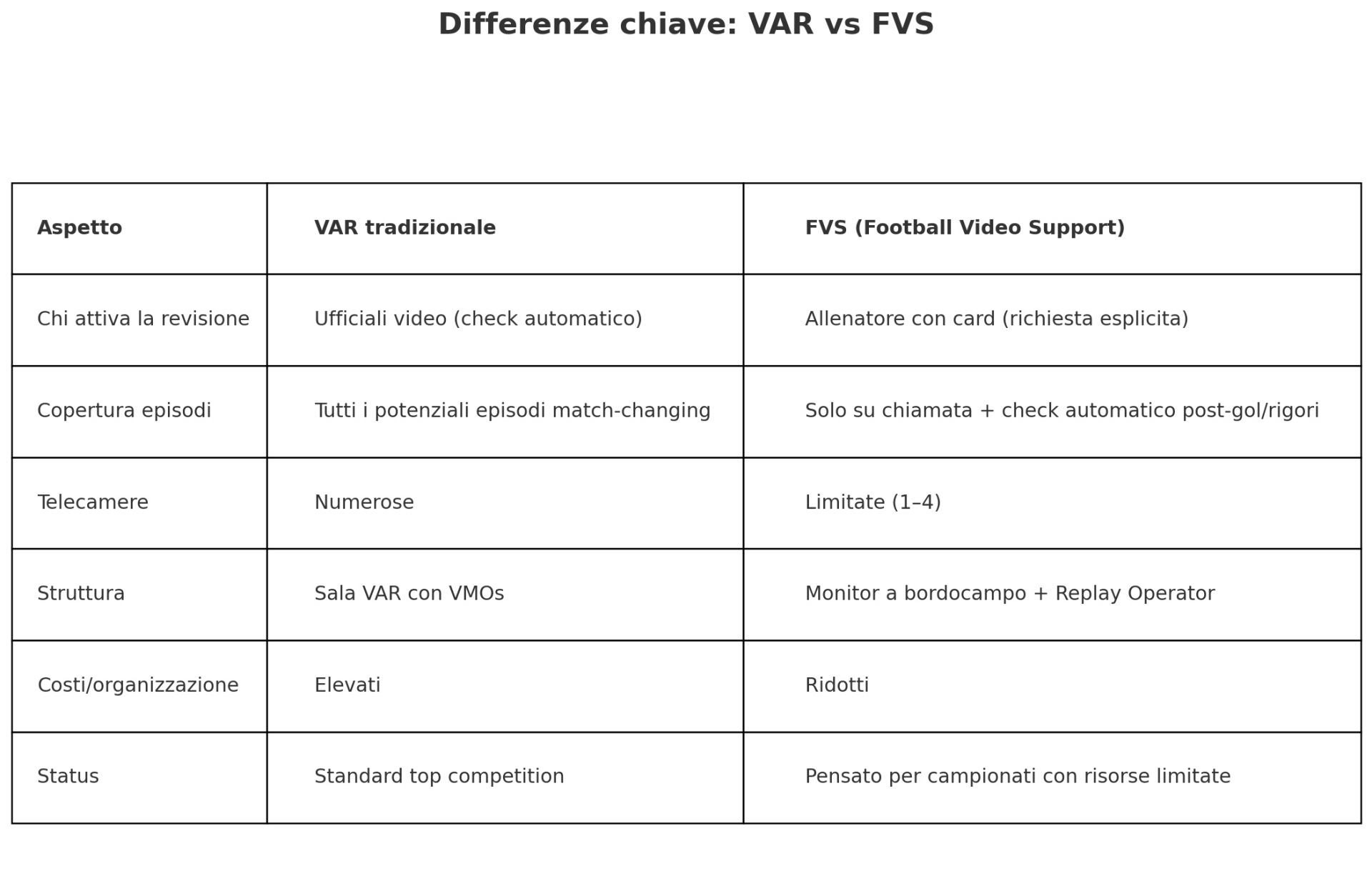 No. Il VAR resta lo standard dove possibile; il FVS è una soluzione alternativa per contesti con poche telecamere e budget ridotti.