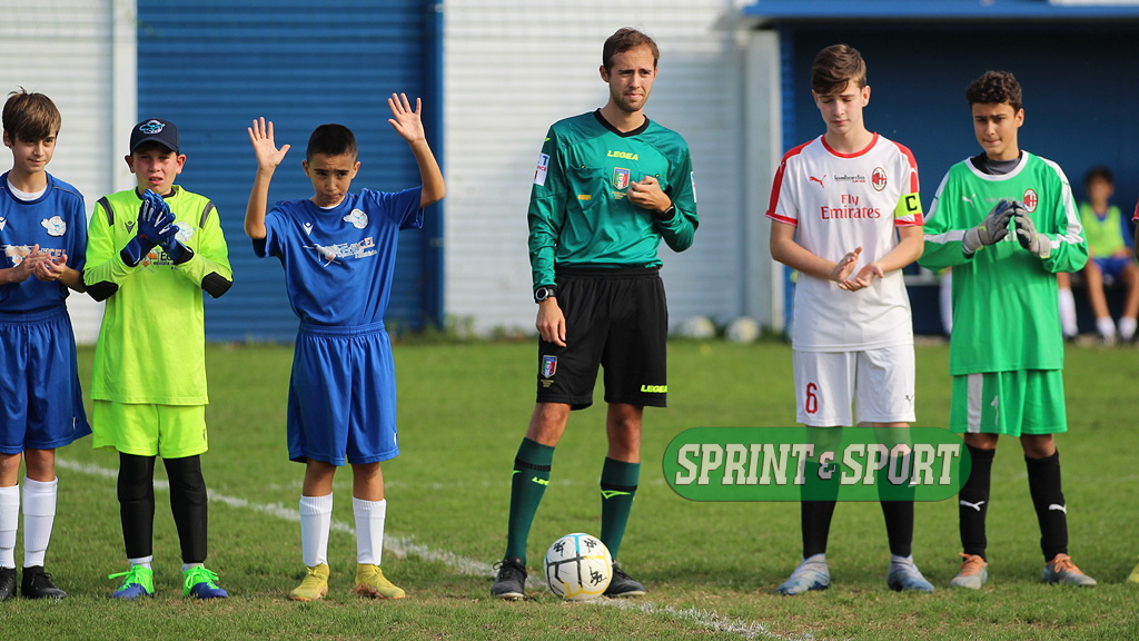 Le squadre schierate in campo agli ordini del direttore di gara Iacopo Demartini della sezione di Milano