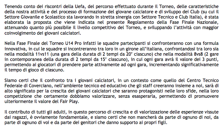 «è stata elaborata la proposta che viene indicata nel presente Regolamento della Fase Finale Nazionale, attenuando quanto più possibile il livello competitivo del Torneo, e sviluppando l’attività con maggior coinvolgimento dei giovani calciatori»