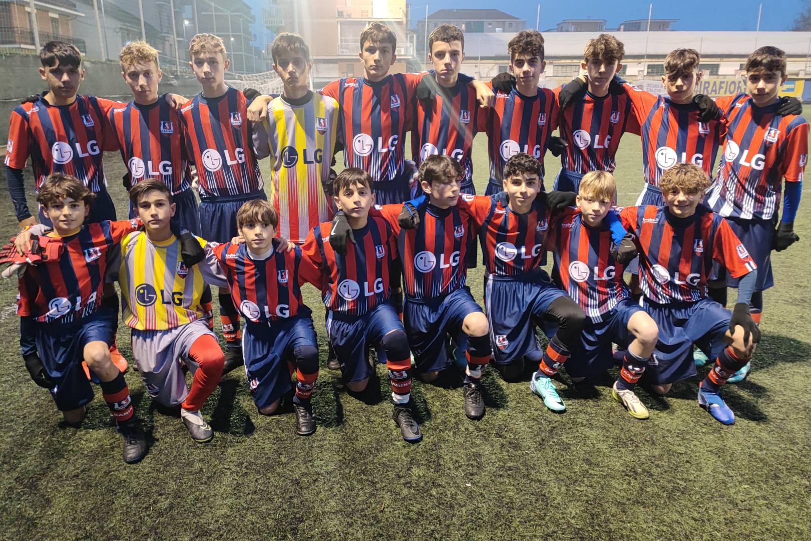 Under 14 Provinciali Mirafiori-Garino 3-2: Eduard George Bugoi, Samuele Palladino e Juri Bresolin festeggiano per i tre gol segnati al Garino in Mirafiori-Garino 3-2