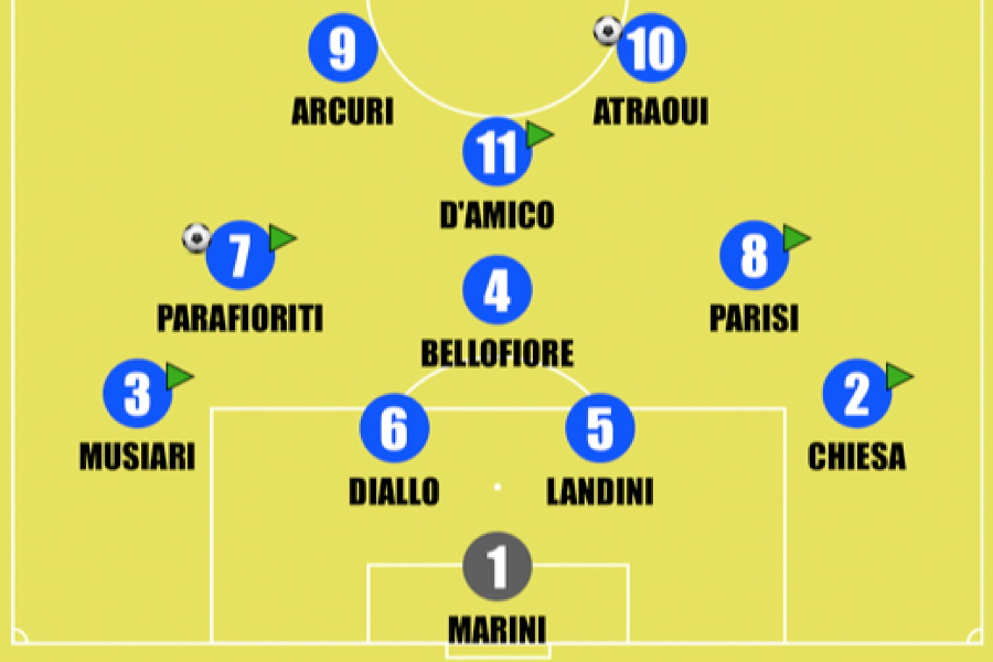 L'undici di Riccardo Nizzola: Chiesa e Musiari esterni bassi ai lati della coppia Landini-Diallo davanti a Marini, a centrocampo Bellofiore è il riferimento centrale con Parisi mezzala destra e Parafioriti mezzala sinistra con il compito di accentrarsi per andare a formare il doppio-play, davanti c'è D'Amico alle spalle del tandem Atraoui-Arcuri